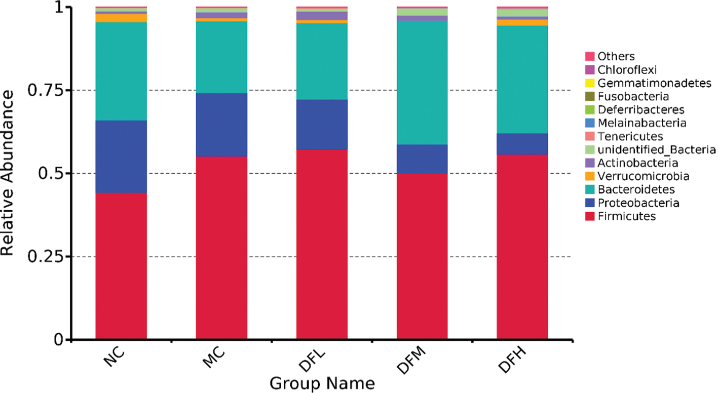 The phylogenetic differences between gut microbiota from NC, MC, DFL, DFM, and DFH groups of mice were assessed using PCoA analysis based on Bray-Curtis arithmetic (Fig. 7). Green tea leaf powder had a distinct microbiota composition that clustered separately from MC and NC groups.
