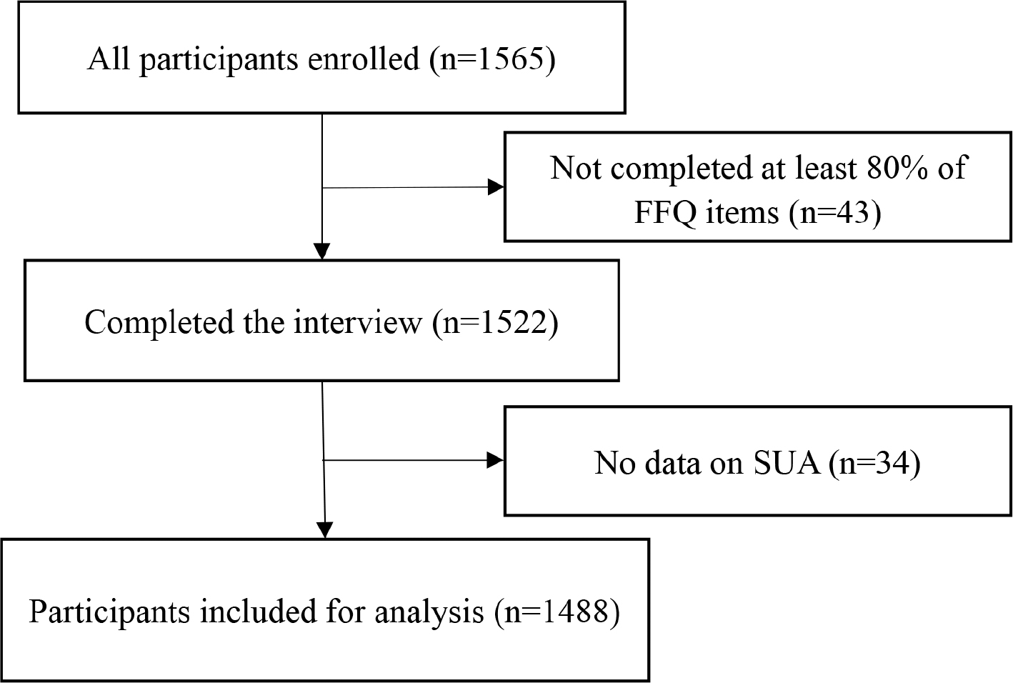 Our study was based on a cross-sectional study that recruited 1,565 adults aged 18–61 years. The participants were enrolled randomly at a Beijing community hospital according to computer-generated random numbers for health checkup between October 2010 and January 2011. Participants with previously diagnosed gout were excluded. The respondents who did not complete at least 80% of the food frequency questionnaire (FFQ) (n = 43) and those having >20% missing SUA measures (n = 34) were excluded from analysis. Finally, 1,488 participants were included for analysis. The selection process of participants in this study is shown in Fig. 1.