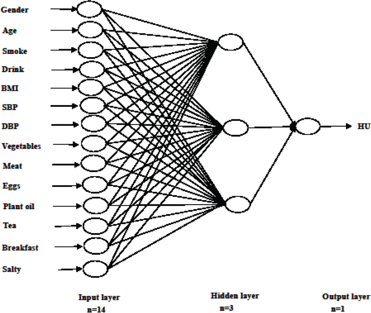 We built ANN model on the basis of the predictors of HU risk resulting from logistic regression analysis. The following predictors were used as model inputs: gender, age, smoking status, drinking status, BMI, SBP, DBP, vegetable frequency, meat frequency, eggs frequency, plant oil frequency, tea frequency, breakfast frequency, and the salty cooking style. The binary variable of whether an individual was suffering from HU was the output variable. In this analysis, the structure of BP neural network included three layers (Fig. 2). Parameters were selected according to previous related studies (14, 15). The training parameters such as learning rate and momentum were set at their default values. The training function was based on the Levenberg–Marquardt algorithm. The neural network was trained for 100 epochs. Dropping out 20% of input units and 50% of hidden units was often found to be optimal. It was a simple way to prevent neural networks from over-fitting (24). Each data point was weighed based on its outcome ratio, which was done to ensure that the output result was not heavily skewed toward dominant class. There were 14 neurons in the input layer, three neurons in the hidden layer, and neurons in the output layer of the ANN model corresponding to the forecast variable (that is the probability of having HU).