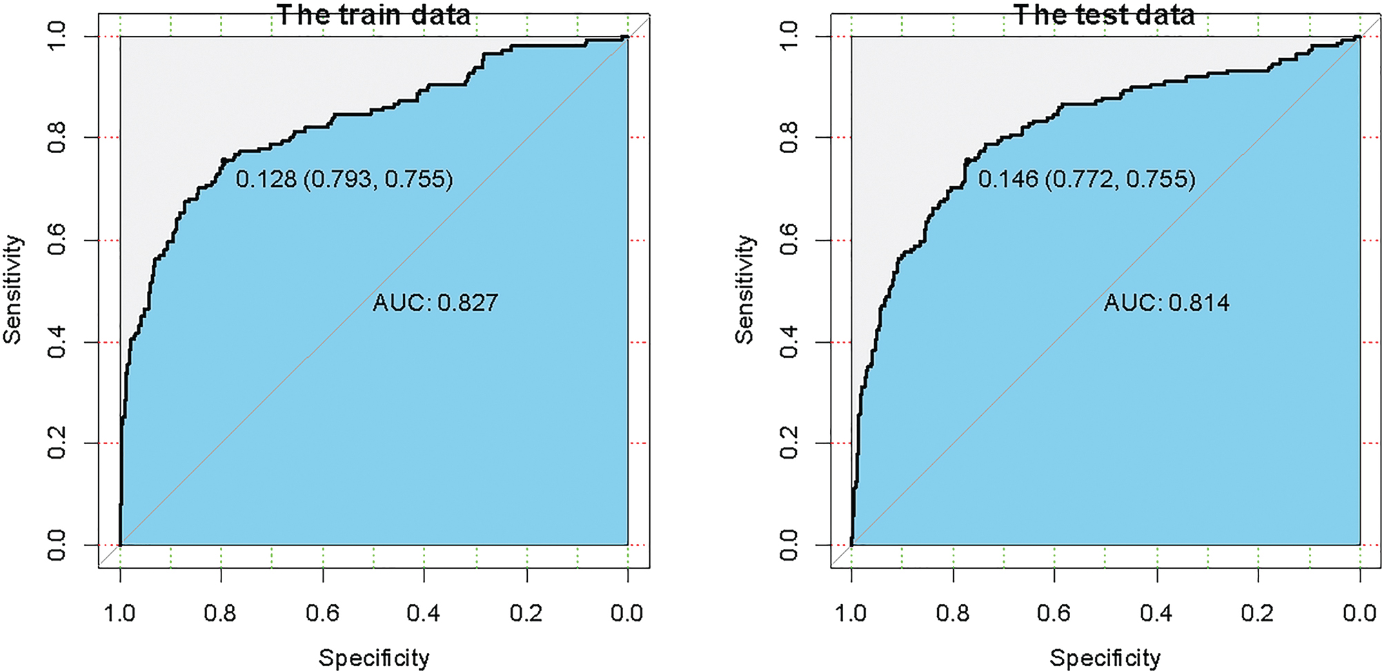 Fig. 3. The receiver operating characteristic (ROC) curves obtained from the artificial network model (ANN) in training and test data sets.
