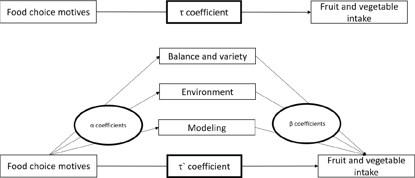 The overall associations (path τ) between food choice motives (predictor variables) and fruit and vegetable intakes (outcome variables) were calculated by regressing the outcome variables on each food choice motive (health, convenience, sensory appeal, price, and familiarity).