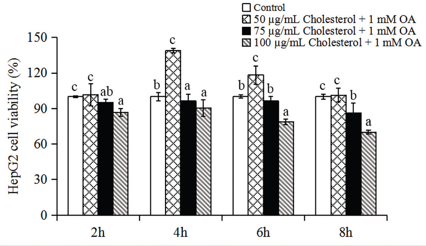 Fig. 1. The effects of different concentrations of cholesterol and 1 mM oleic acid (OA) on the viability of HepG2 cells after treatment for 2, 4, 6 and 8 h. Data represent the means ± standard deviations (n = 3). Statistical differences between groups were determined by a one-way ANOVA. Different letters indicate statistically significant differences between groups, P < 0.05.