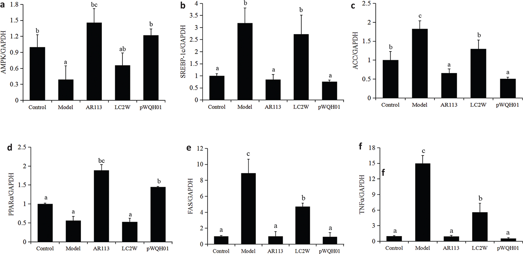 Fig. 4. The effects of probiotic strains on the mRNA expression of key lipid-regulating genes in HepG2 cells stimulated with oleic acid OA and cholesterol. (a) AMPK, (b) SREBP-1c, (c) ACC, (d) PPARα, (e) FAS and (f) TNFα. Data represent the means ± standard deviations (n = 3). Statistical differences between groups were determined by a one-way ANOVA. Different letters indicate statistically significant differences between groups, P < 0.05.