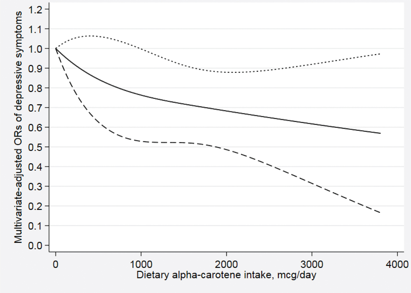Fig. 2. Dose–response relationship between dietary alpha-carotene intake and depressive symptoms. The association was adjusted for age, gender, ethnicity, educational level, body mass index, annual family income, work physical activity, recreational physical activity, hypertension, diabetes, smoking status, drinking status, and total energy intake. The solid line and dash line represent the estimated ORs and its 95% confidence intervals, respectively. OR, odds ratio.