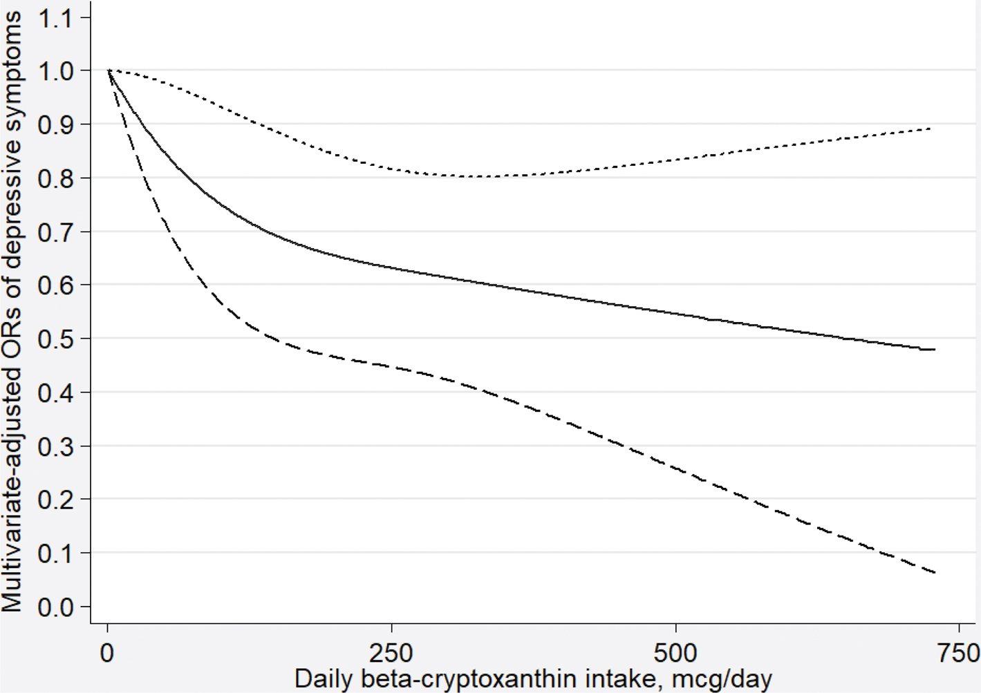 Fig. 4. Dose–response relationship between dietary beta-cryptoxanthin intake and depressive symptoms. The association was adjusted for age, gender, ethnicity, educational level, body mass index annual family income, work physical activity, recreational physical activity, hypertension, diabetes, smoking status, drinking status, and total energy intake. The solid line and dash line represent the estimated ORs and its 95% confidence intervals, respectively. OR, odds ratio.