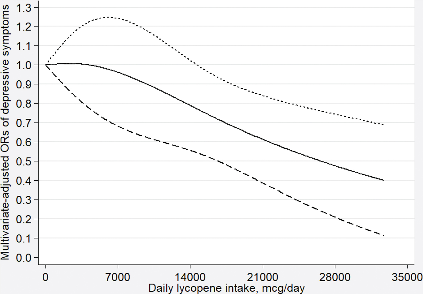 Fig. 5. Dose–response relationship between dietary lycopene intake and depressive symptoms. The association was adjusted for age, gender, ethnicity, educational level, body mass index, annual family income, work physical activity, recreational physical activity, hypertension, diabetes, smoking status, drinking status, and total energy intake. The solid line and dash line represent the estimated ORs and its 95% confidence intervals, respectively. OR, odds ratio.