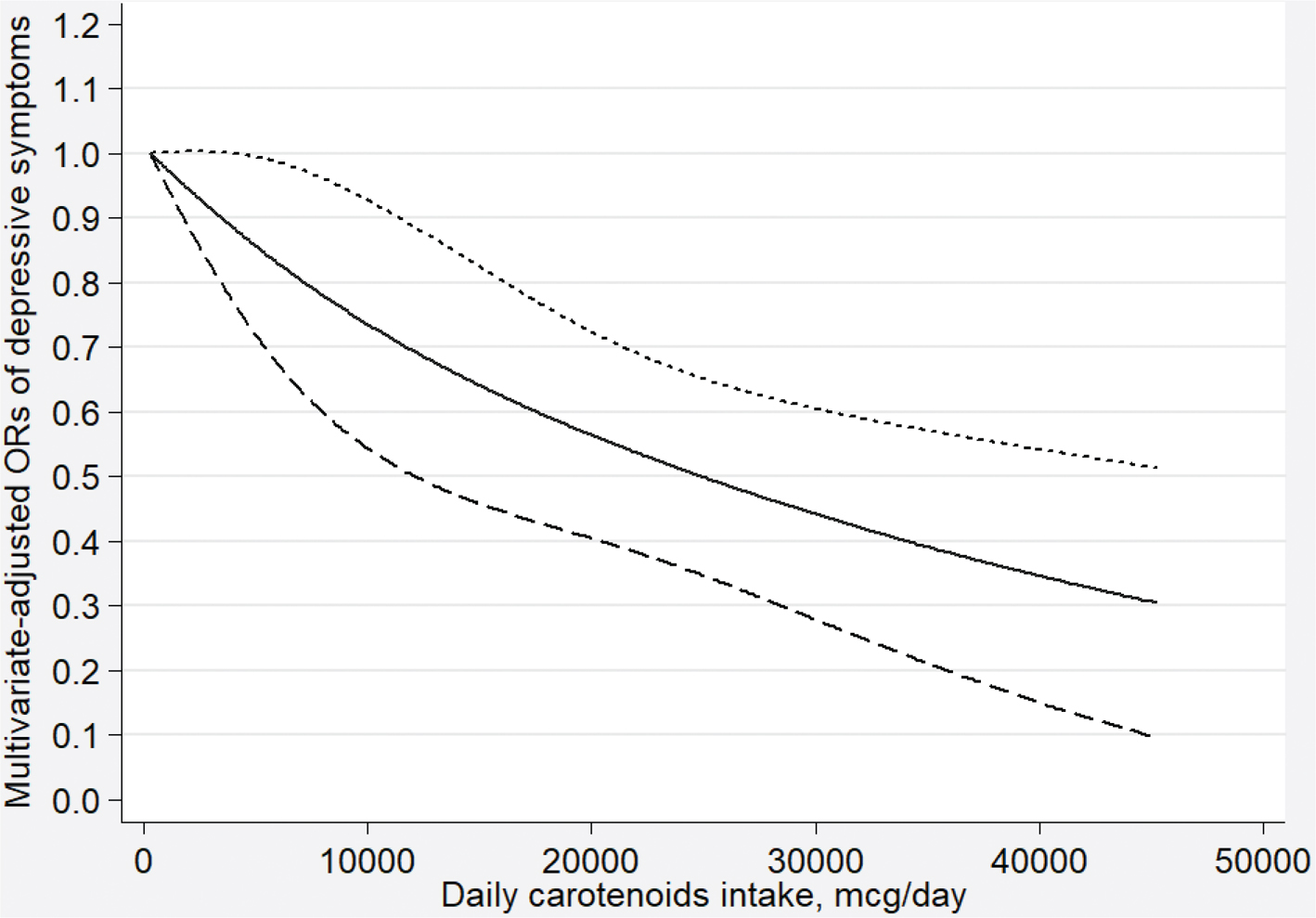 Results: Overall, a total of 17,401 adults aged 18–80 years were included in this study. After adjustment for potential confounders, the odds ratios (95% confidence intervals) of depressive symptoms in the highest versus lowest quartiles were 0.71 (0.56–0.92) for alpha-carotene, 0.59 (0.47–0.75) for beta-carotene, 0.71 (0.55–0.92) for beta-cryptoxanthin, 0.66 (0.49–0.89) for lycopene, 0.50 (0.39–0.64) for lutein with zeaxanthin, and 0.59 (0.45–0.78) for total carotenoid intake. U-shaped dose–response relationships were found between both beta-carotene and lutein with zeaxanthin intake and the risk of depressive symptoms.