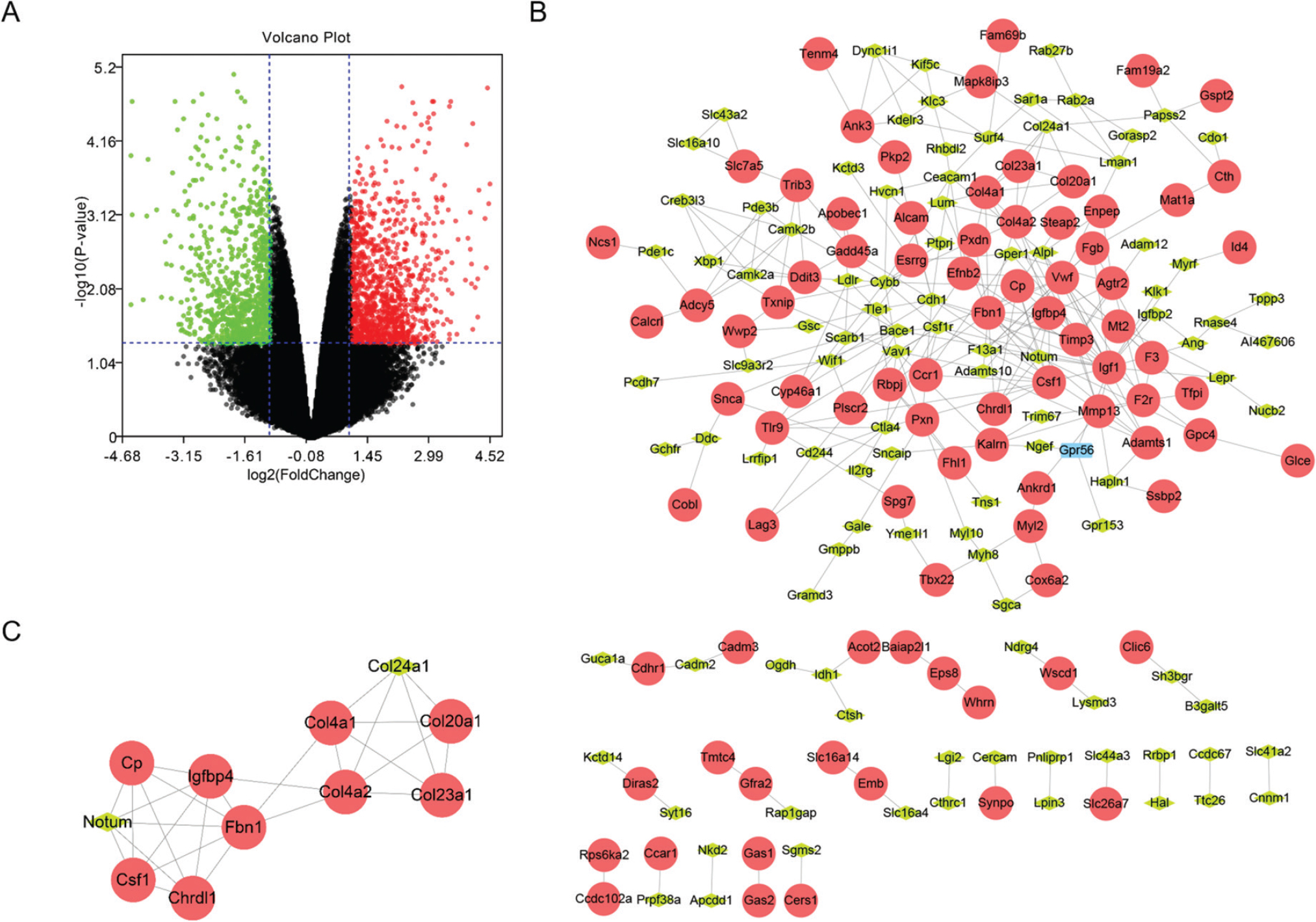 Fig. 1. DEGs identification, PPI network construction and module analysis. (a) Volcano plot of DE-mRNAs from GSE37676 data sets, the red and green dots represent the upregulation and downregulation (logFC >1.5 or < –1.5). (b) The PPI network of DEGs from GSE37676 set was constructed using Cytoscape. (c) Significant module was obtained from PPI network. The color of node in the PPI network reflects the log (FC) value of the Z-score of gene expression, and the size of node indicates the number of interacting proteins with designated protein.