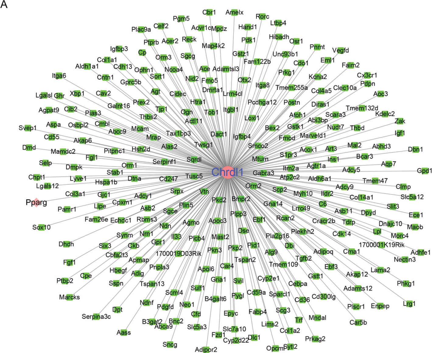 Gene co-expression that showed functional association with Chrdl1 was estimated by COEXPEDIA database to examine the effect and molecular mechanism of Chrdl1 on disease. Chrdl1 had a co-expression with 274 genes (Fig. 2). Interestingly, Chrdl1 was co-expressed with PPARγ.