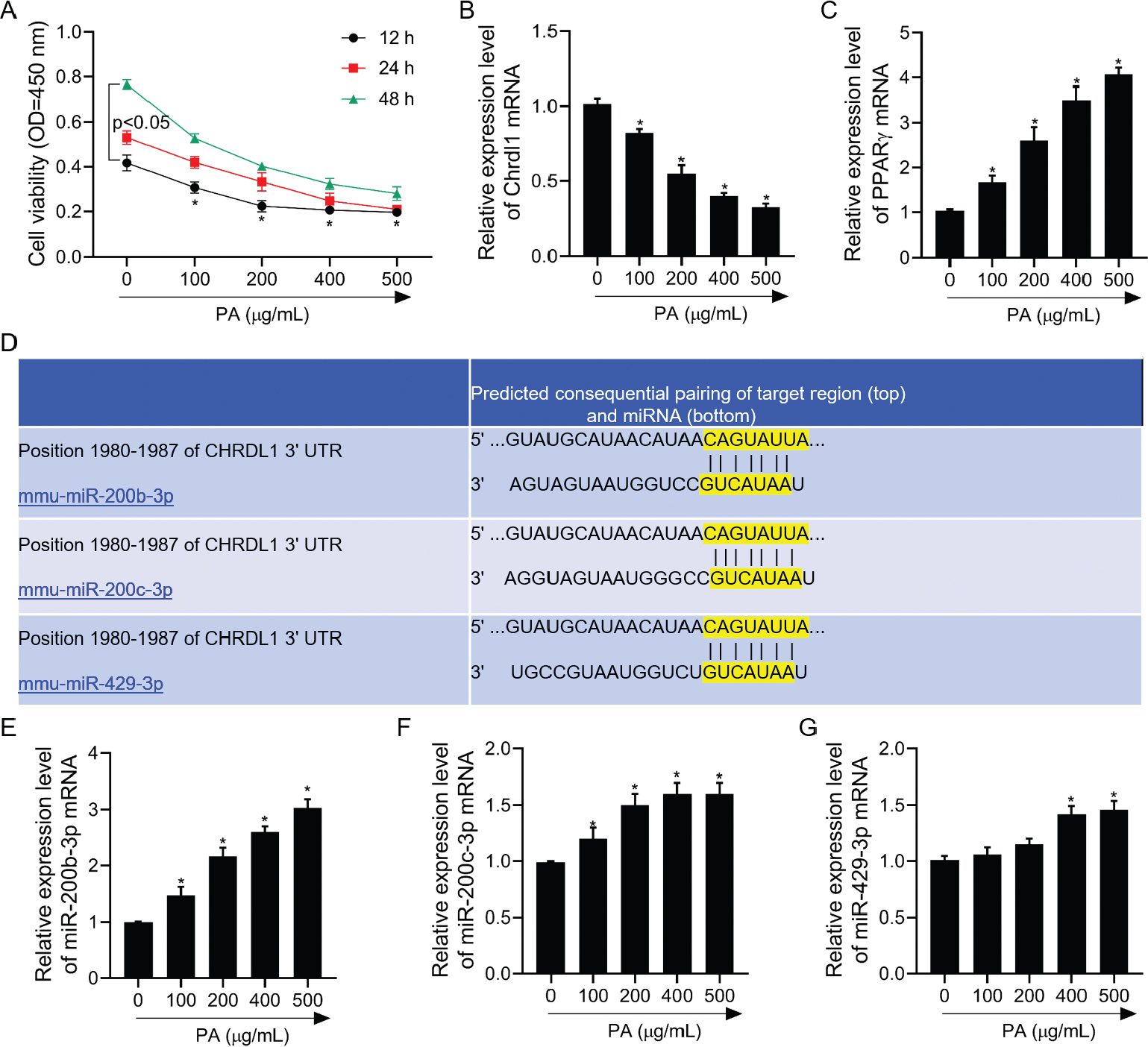 The viability of cells was significantly decreased after 12/24/48 h of PA treatment at 500, 400, 200, 100, and 0 μg/mL with MC3T3-E1 cells (Fig. 3a). Next, cells treated with PA at 200 μg/mL for 12 h were used to perform follow studies. Chrdl1 and PPARγ mRNA expression decreased depending on dose (Figs. 3b and 3c). Furthermore, we found that Chrdl1 was the miR-426-3p, miR-200c-3p, and miR-200b-3p target gene of TargetScan database (Fig. 3d). This study found that PA significantly increased miR-426-3p mRNA, miR-200c-3p, and miR-200b-3p expressions, which presented dosage-dependency relations (Figs 3e–3g). The amplification multiples of miR-200b-3p mRNA were higher than that of miR-200c-3p/429-3p by RT-PCR assay. Therefore, miR-200b-3p was used to perform follow studies.