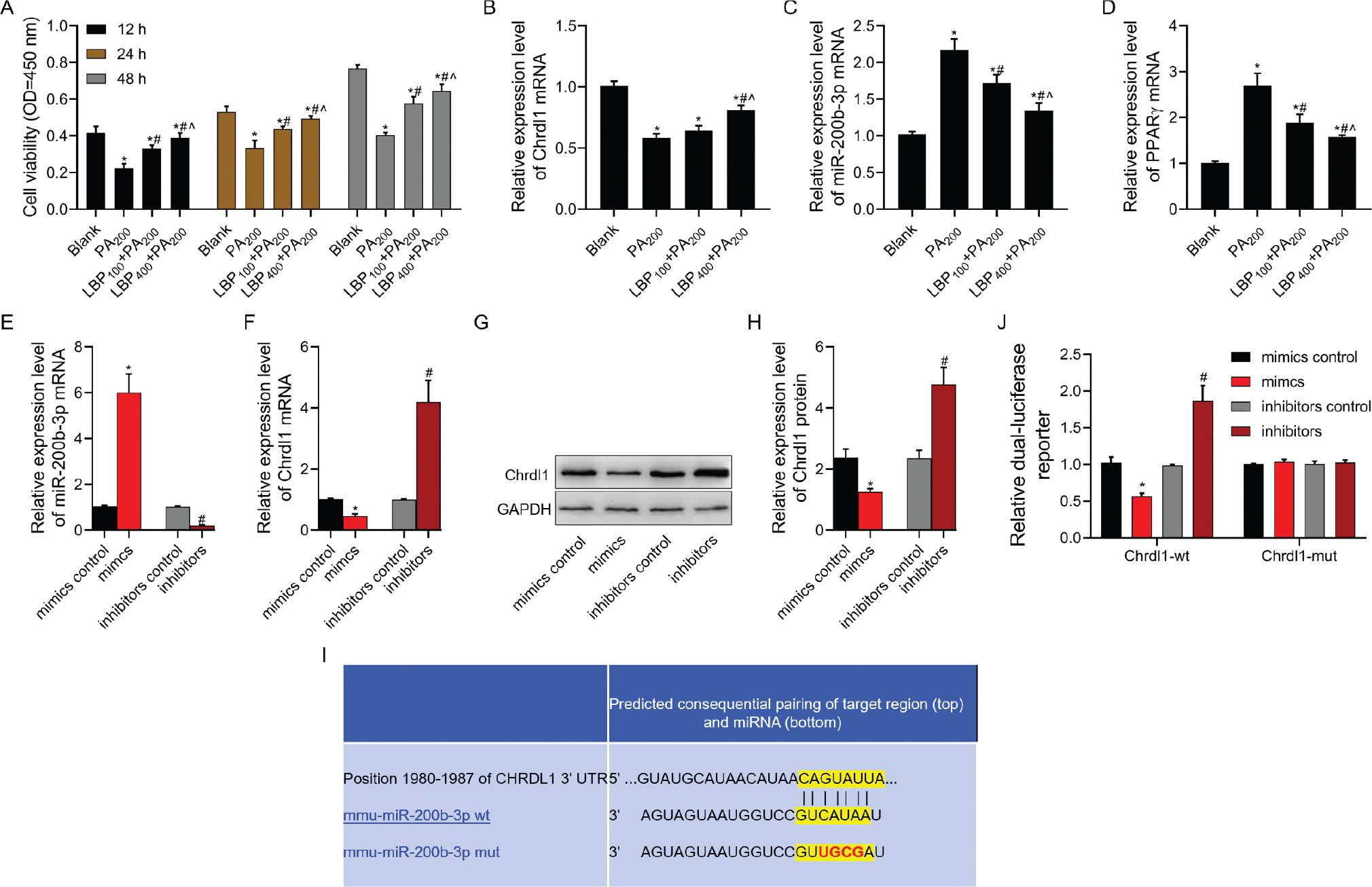 Conclusions: LBPs inhibit PA-induced MC3T3-E1 cell apoptosis by mainly decreasing miR-200b-3p to upregulate Chrdl1, but miR-200b-3p/Chrdl1/PPARγ is not the only mechanism for LBPs protecting osteoblasts from PA.