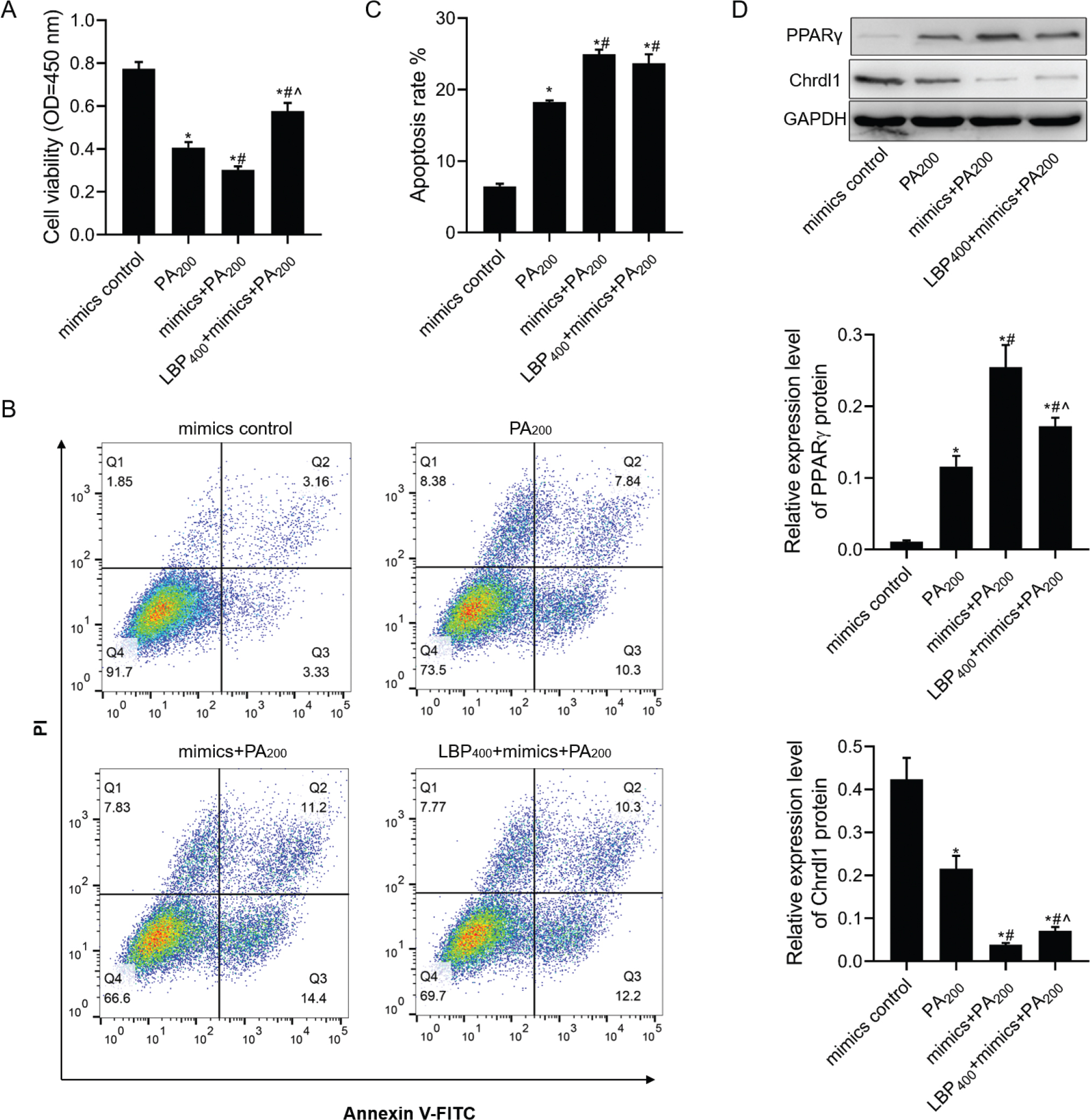 Fig. 5. LBP inhibited PA-mediated apoptosis in MC3T3-E1 cells transfected with miR-200b-3p mimics. After cells transfected with miR-200b-3p, mimics were treated with LBP and PA: (a) CCK-8 assay was used to detect cell viability; (b, c) flow cytometry was used to detect cell apoptosis; (d) western blot assay was used to detect PPARγ and Chrdl1 protein levels. GAPDH was used as a load control. Data are presented as mean ± SD. *P < 0.05 versus mimics negative control group, #P < 0.05 versus PA200 group, and ^P < 0.05 versus mimics+PA200 group.