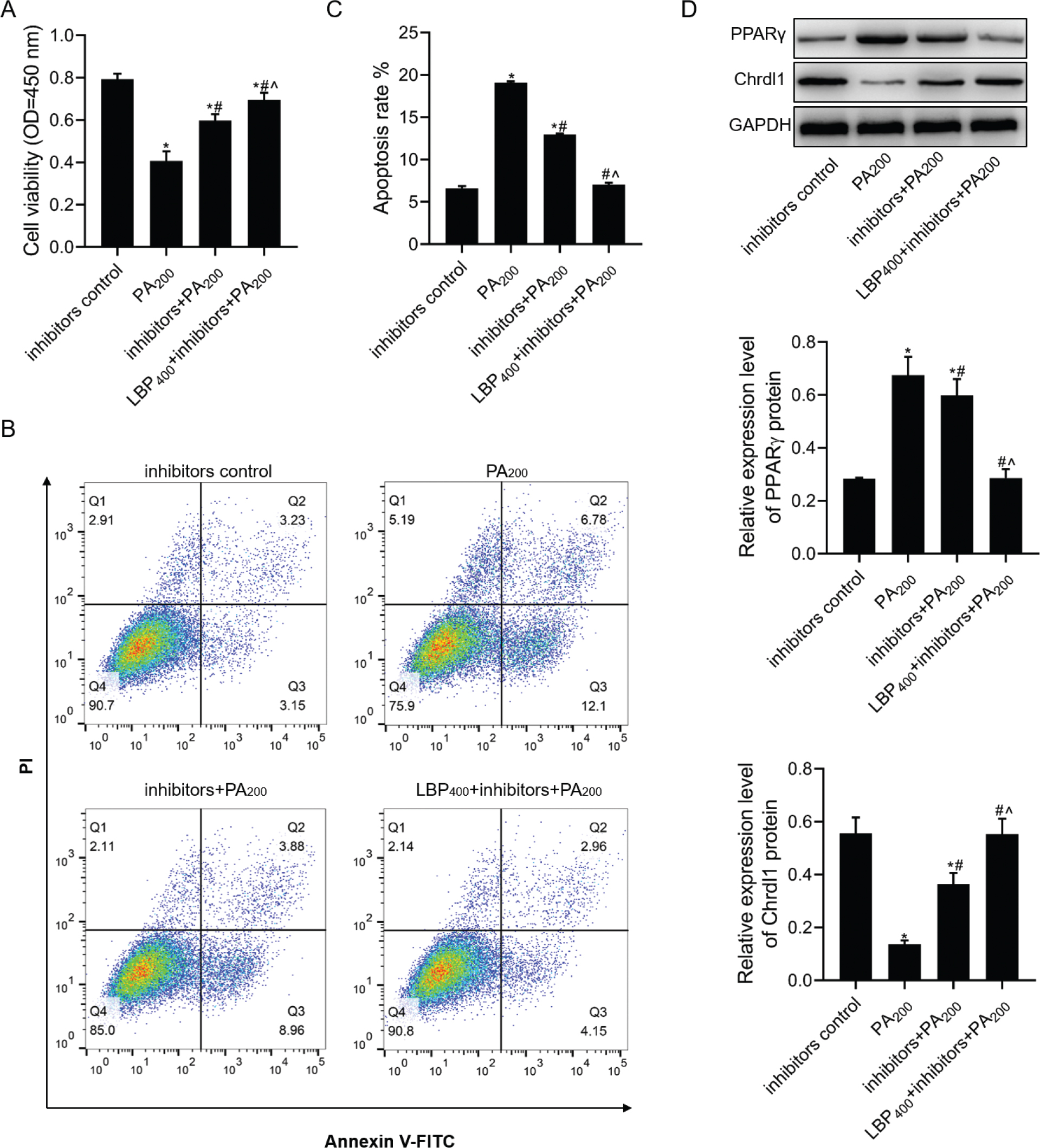 Fig. 6. LBP further inhibited PA-mediated apoptosis in MC3T3-E1 cells transfected with miR-200b-3p inhibitors. After cells transfected with miR-200b-3p, inhibitors were treated with LBP and PA: (a) CCK-8 assay was used to detect cell viability; (b,c) flow cytometry was used to detect cell apoptosis; (d) western blot assay was used to detect PPARγ and Chrdl1 protein levels. GAPDH was used as a load control. Data are presented as the mean ± SD. *P < 0.05 versus inhibitors negative control group, #P < 0.05 versus PA200 group, and ^P < 0.05 versus inhibitors+PA200 group.