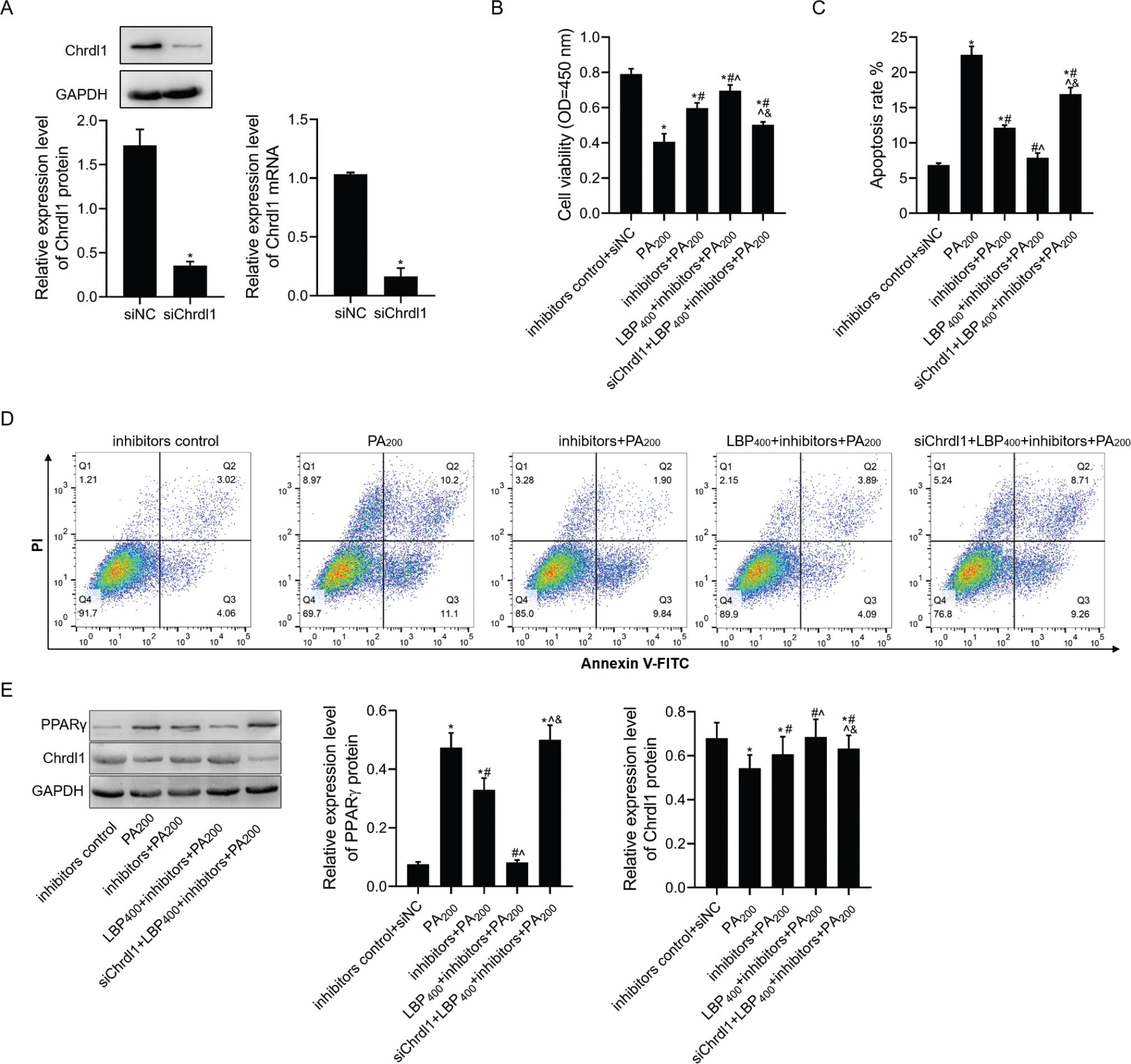 Fig. 7. LBP affected PA-mediated apoptosis by regulating miR-200b-3p/Chrdl1/PPARγ. (a) Western blot and RT-PCR assays were used to detect the protein and mRNA levels of Chrdl1 in cells transfected with siChrdl1 after cells were transfected with inhibitors and siChrdl1 was treated with LBP and PA; (b) CCK-8 assay was used to detect cell viability; (c,d) flow cytometry was used to detect cell apoptosis; (e) western blot assay was used to detect PPARγ and Chrdl1 protein levels. GAPDH was used as a load control. Data are presented as mean ± SD. *P < 0.05 versus inhibitors control+siNC group, #P < 0.05 versus PA200 group, ^P < 0.05 versus inhibitors+PA200 group, and &P < 0.05 versus LBP400+inhibitors+PA200 group.