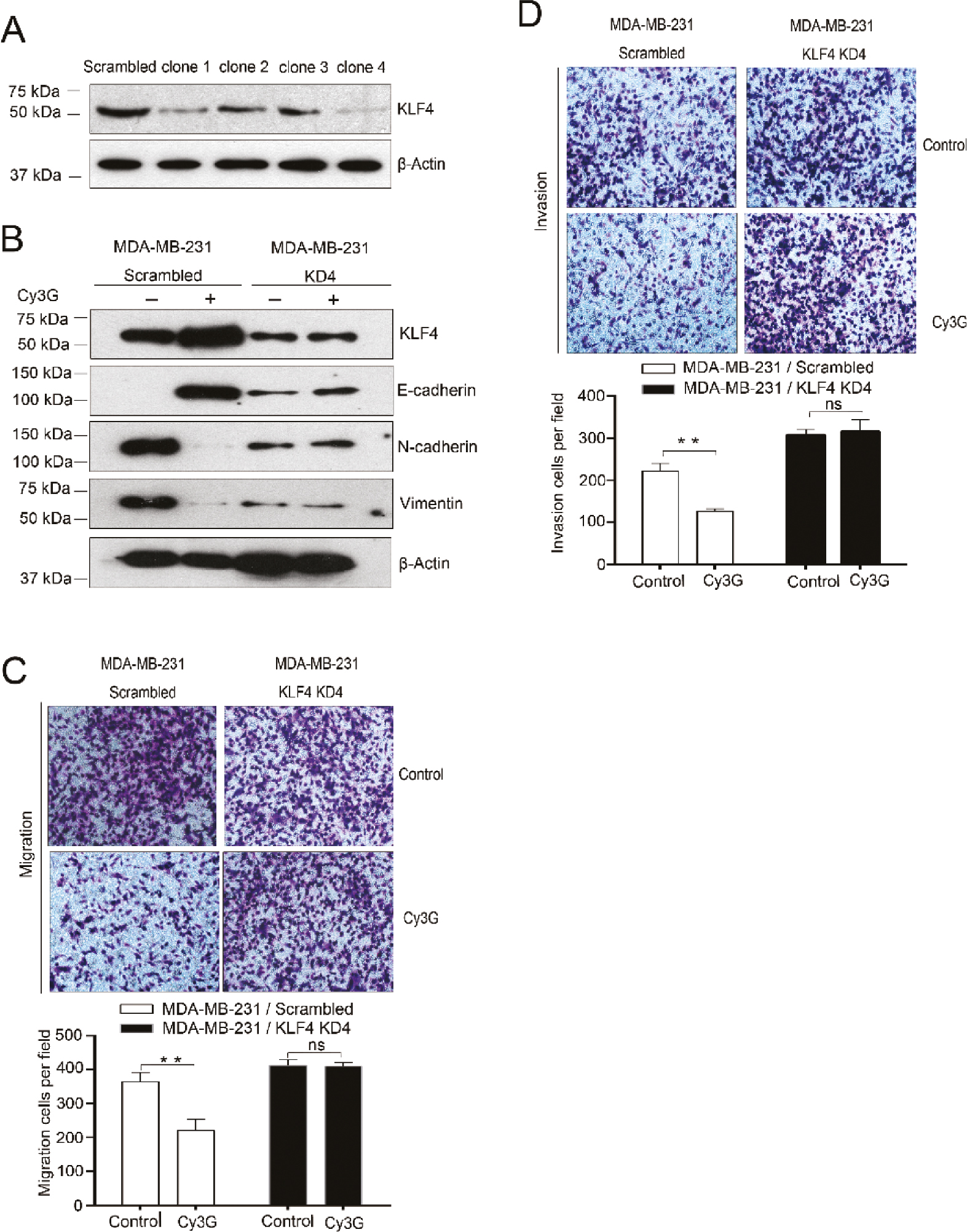 Fig. 3. Expression of EMT marker genes and migration and invasion of KLF4-knockdown MDA-MB-231 cells after treatment with cyanidin-3-O-glucoside. (A) KLF4 protein expression level in 293T cells transfected either with scrambled or with KLF4 shRNAs. (B) Expression of EMT marker genes in scrambled MDA-MB-231 and in KLF4-knockdown MDA-MB-231 cells in the presence or absence of Cy3G. (C) Representative images (magnification, ×100) and statistical results of Transwell migration assays of KLF4-knockdown and scrambled MDA-MB-231 cells in the presence or absence of Cy3G, P > 0.05. (D) Representative images (magnification, ×100) and statistical results of Matrigel invasion assays of KLF4-knockdown and scrambled MDA-MB-231 cells in the presence or absence of Cy3G, P > 0.05. Both migration and invasion assay results were from three separate cell cultures, and the assays were repeated three or four times. The values are expressed as mean ± SEM.