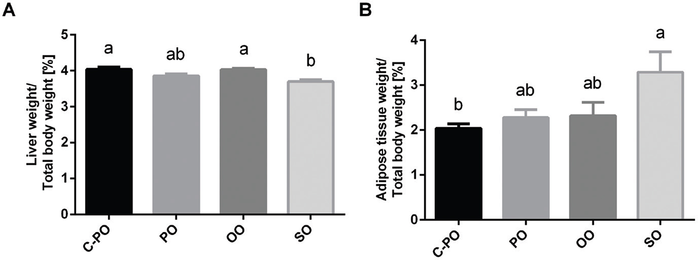 The SO diet group had significantly lower liver tissue weight-to-body weight ratio (3.70 ± 0.05) (Fig. 3A) and the highest adipose tissue weight-to-body weight ratio (3.29 ± 0.45) (Fig. 3B), P < 0.05, while the C-PO diet group had the highest liver tissue weight-to-body weight ratio (4.04 ± 0.07) (Fig. 3A) and the lowest adipose tissue weight-to-body weight ratio (2.04 ± 0.10) (Fig. 3B), P < 0.05.