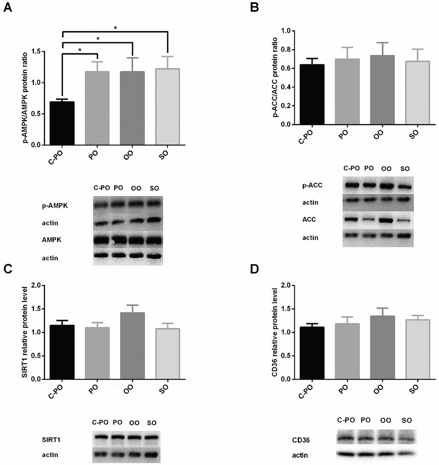 The p-ACC/ACC ratio and protein levels of SIRT1 and CD36 showed no significant differences between the groups. The p-AMPK/AMPK ratio showed no significant differences using a Tukey’s Kramer test. However, there was a significant difference (P < 0.05) between the C-PO diet and the other diets when analyzed using the Student’ t-test.