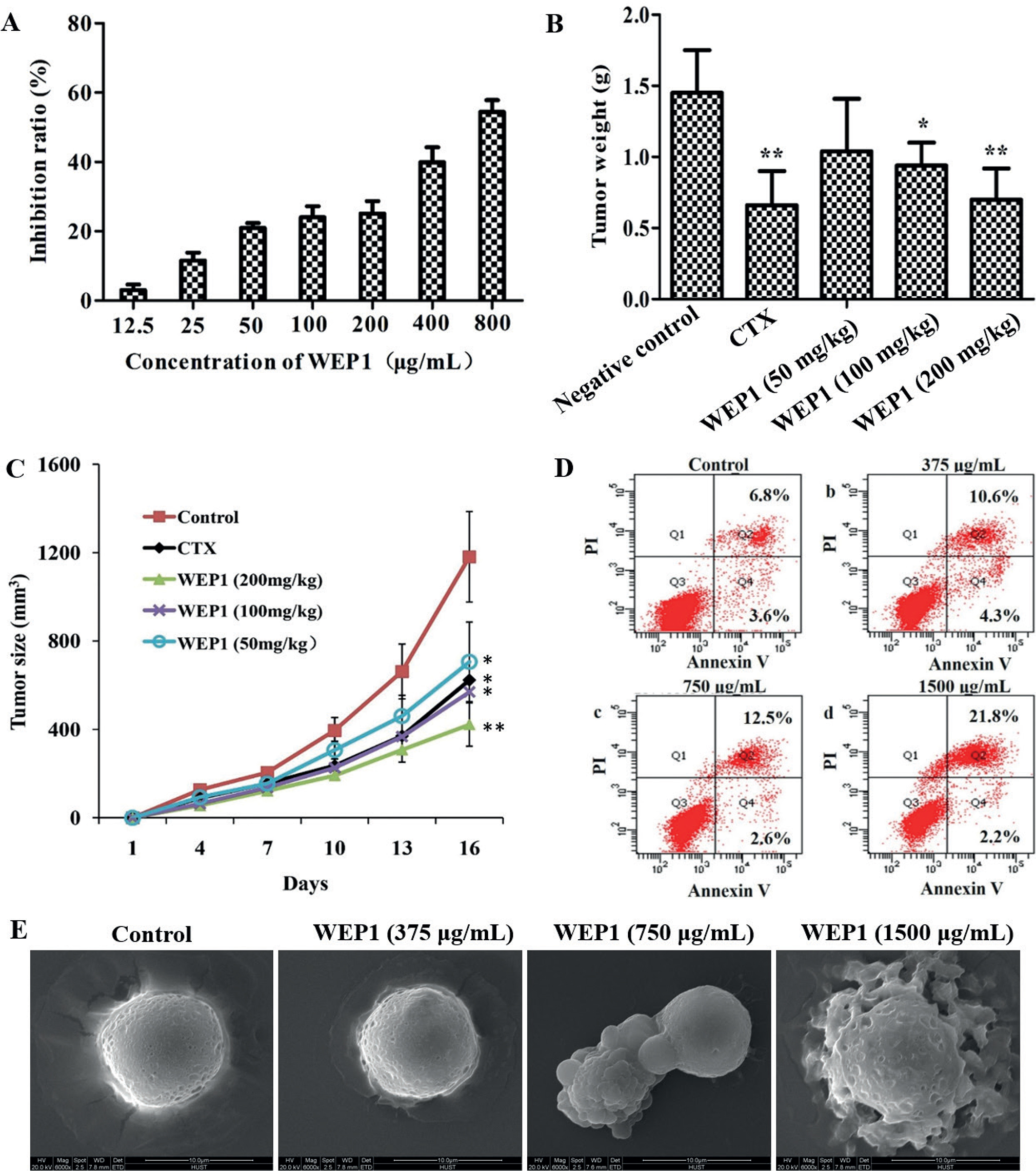 Fig. 2. Effects of WEP1 on the growth inhibition of H22 cells and H22-bearing mice. (A) Inhibitory effect in vitro of WEP1 against H22 cells at 24 h treatment. (B, C) Inhibitory effect of polysaccharide WEP1 on H22 tumor growth in BALB/c mice. *P < 0.05 and **P < 0.01 compared with negative control group. (D) WEP1-induced apoptosis in H22 cells. Apoptosis was assayed by flow cytometry after cells were treated without (a, control) or with (b) 375, (c) 750, and (d) 1,500 μg/mL of WEP1 for 24 h. (E) Scanning electron micrographs (magnification ×6,000) of H22 cells showed the surface morphology changes of the cells. Data were presented as means ± SD of three independent experiments. Values were based on eight mice in each group.
