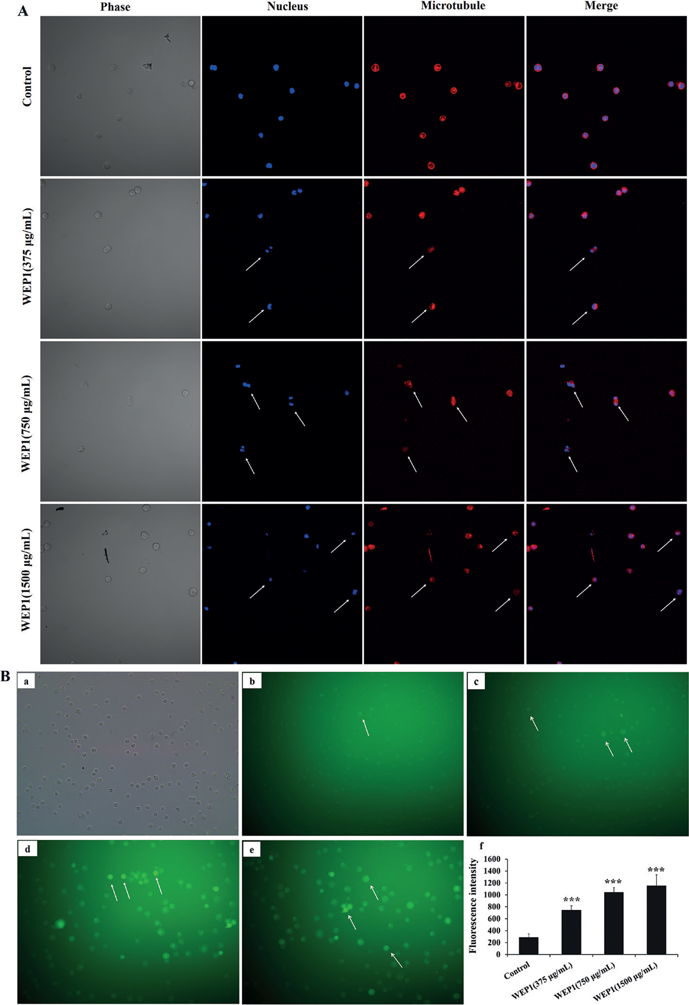 Fig. 3. Effects of WEP1 on the inhibition of tubulin polymerization and the levels of intracellular ROS in H22 cells. (A) Disruption of microtubule network in response to WEP1-treated H22 cells was observed under LSCM. Changes were marked with arrows. (B) (a–e) Representative images of ROS fluorescence in different groups: (a) light microscope image of H22 cells; (b) control; (c–e) cells treated with different concentrations of WEP1 (375, 750, and 1,500 μg/mL). (f) Fluorescence intensity of H22 cells. Values were expressed as means ± SD from three independent experiments. ***P < 0.001 compared with control group.