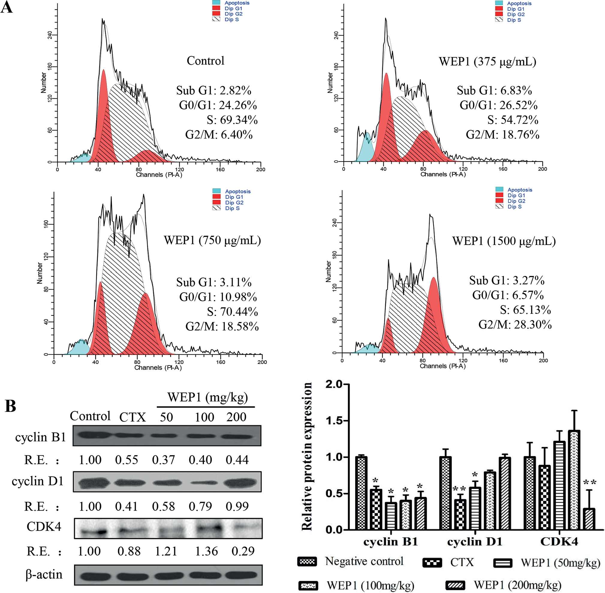 Fig. 4. (A) Analysis of cell cycle distribution of H22 cells by flow cytometer. Cultured H22 cells were treated with 375, 750, and 1,500 μg/mL WEP1 for 24 h. (B) Effects of WEP1 on the expressions of cell cycle proteins in H22 tumor tissues. The relative ratio was expressed as a relative expression (RE) value calculated from the ratio of target protein to β-actin protein. Data represented three independent experiments. *P < 0.05 and **P < 0.01 compared with negative control group.