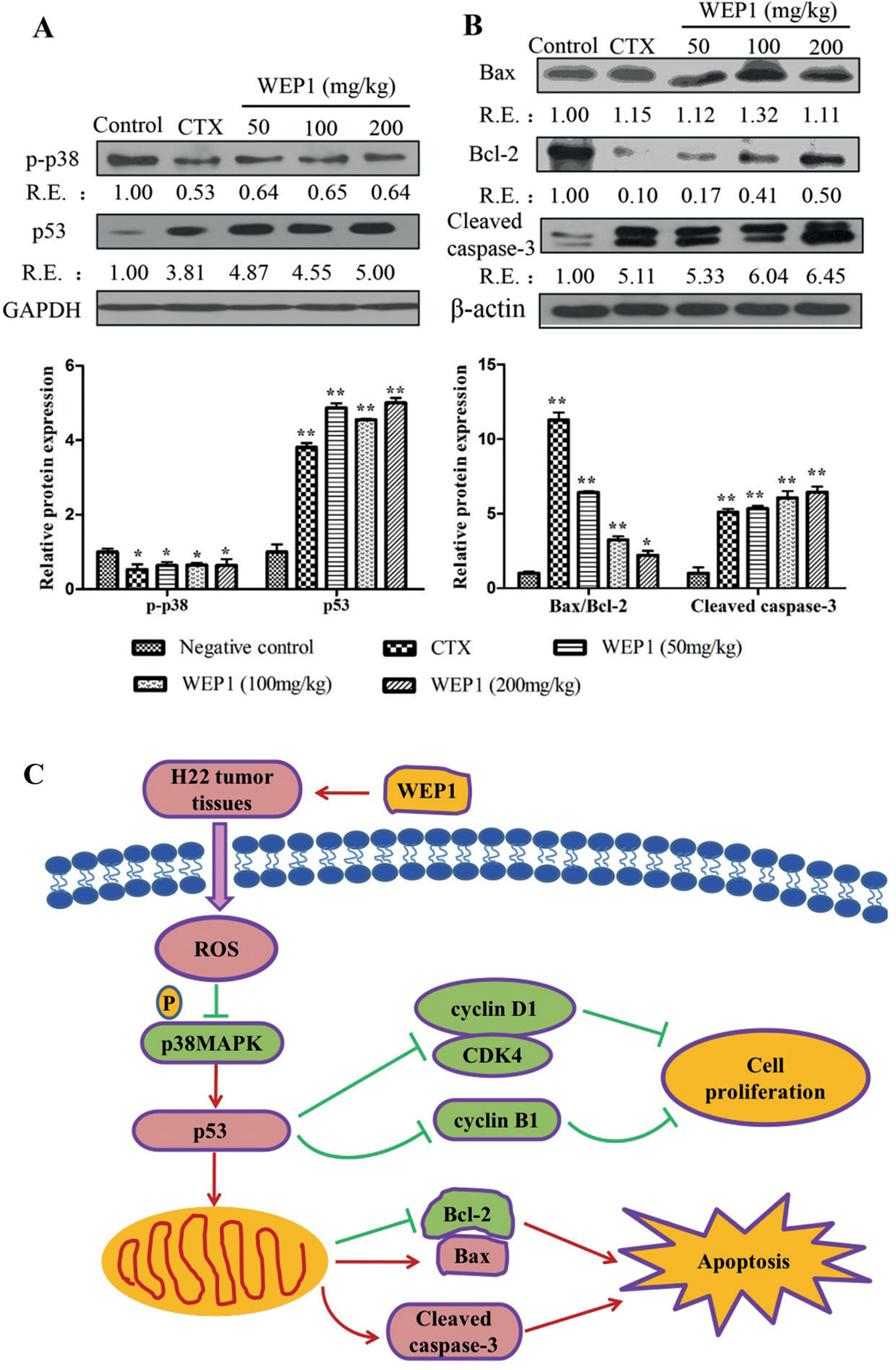 Fig. 5. (A, B) Western blot analyses of apoptosis-related protein expressions by WEP1 treatment in H22 transplanted tumors. The relative ratio was expressed as a relative expression (RE) value calculated from the ratio of target protein to β-actin or GAPDH protein. Data represented three independent experiments. *P < 0.05 and **P < 0.01 compared with negative control group. (C) Potential mechanism of actions of WEP1-regulated cell proliferation and apoptosis in H22-bearing mice through ROS-mediated mitochondrial pathway.