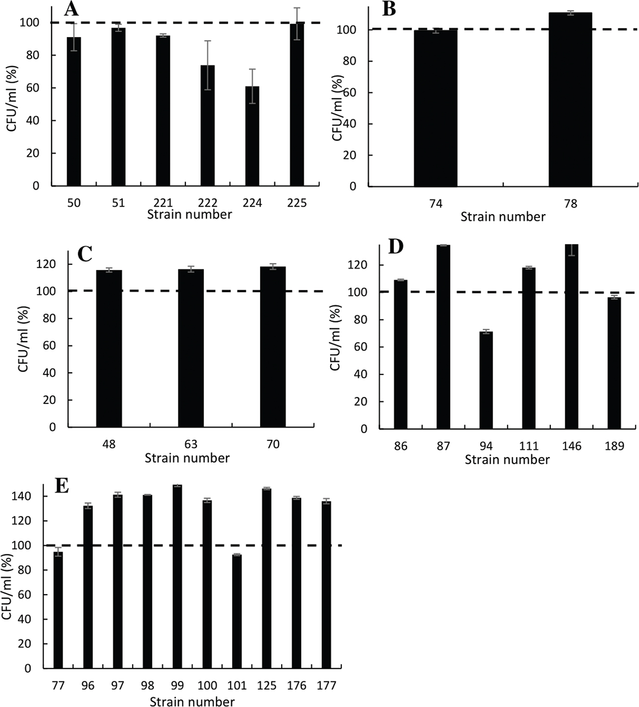 Fig. 3. Survival of the isolated 25 unique strains inoculated in liquid MRS supplemented with 0.4% phenol. Bars show the percentage of CFU/mL after 24 h of incubation; dash line indicates the starting CFU (normalized to 100%). Graph A, B. coagulans; graph B, E. hirae; graph C, E. faecium; graph D, E. mundtii; and graph E, P. pentosaceus.