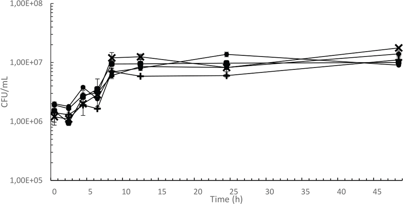 Fig. 5. Growth curve of selected P. pentosaceus strains in fava bean beverage without additional carbon sources. Strain numbers and their symbols are: 77 (●), 96 (▲), 97 (■), 100 (×), 176 (+). Error bars represent standard errors.