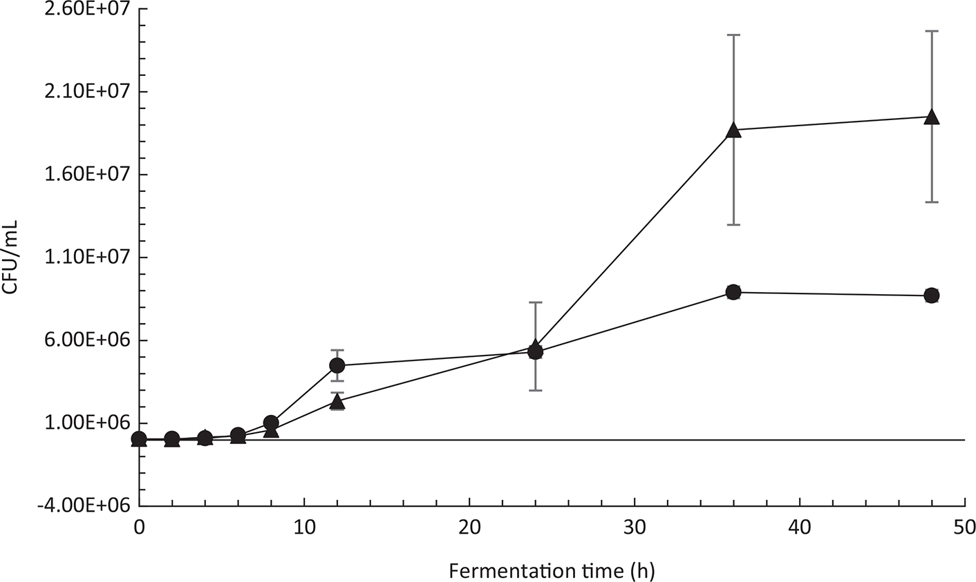 Fig. 6. Growth curve of P. kudriavzevii TY1322 in monoculture and in co-fermentation with P. pentosaceus strain 77 in fava bean medium. Symbols correspond to: P. kudriavzevii TY1322 in monoculture (●) and in co-fermentation (▲). Error bars represent standard errors.