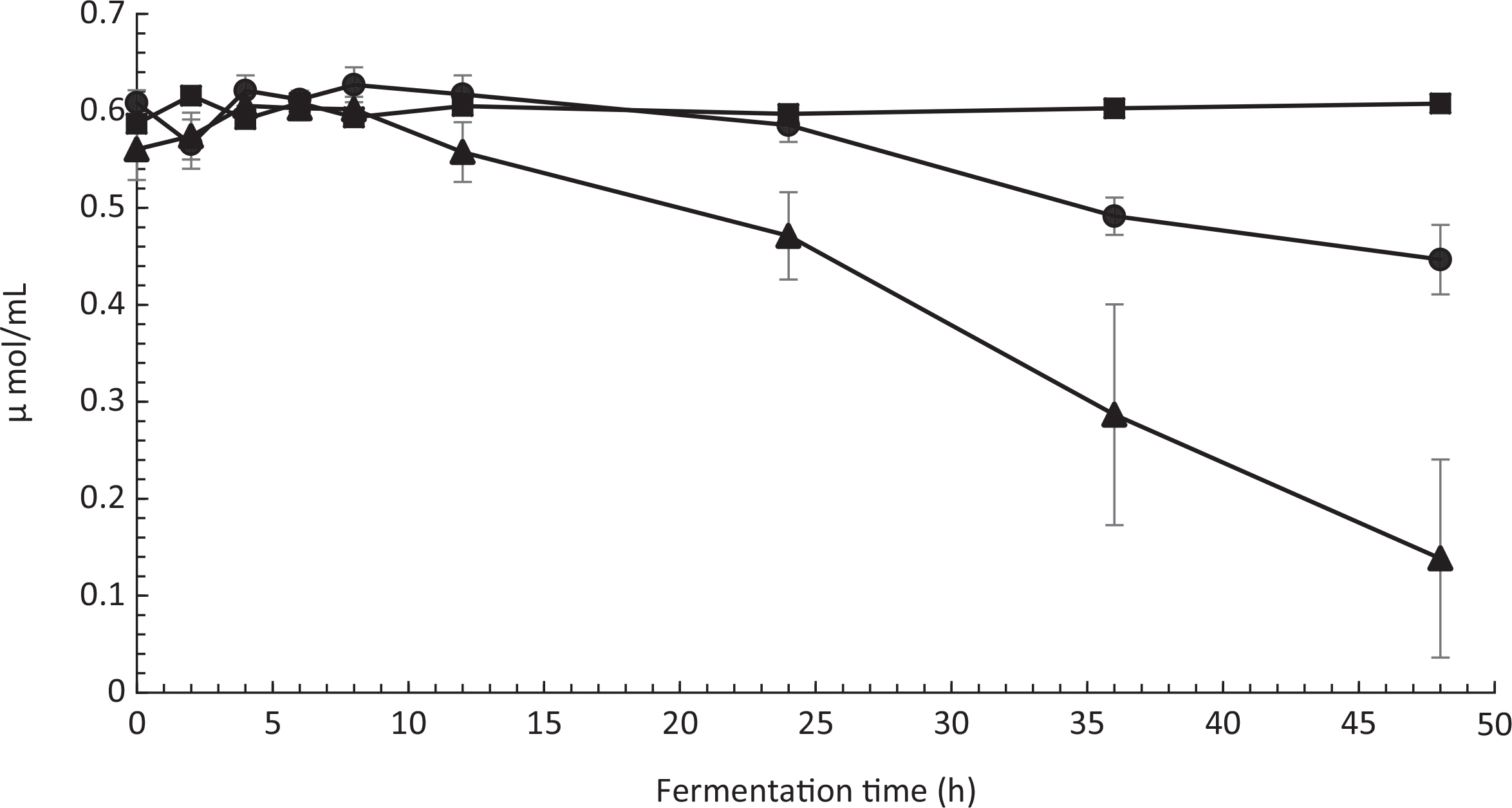 Fig. 7. Phytate content in fava bean medium fermented by P. kudriavzevii TY1322 (●), P. pentosaceus strain 77 (■), and by co-fermentation of both P. kudriavzevii and P. pentosaceus (▲). Error bars represent standard errors.