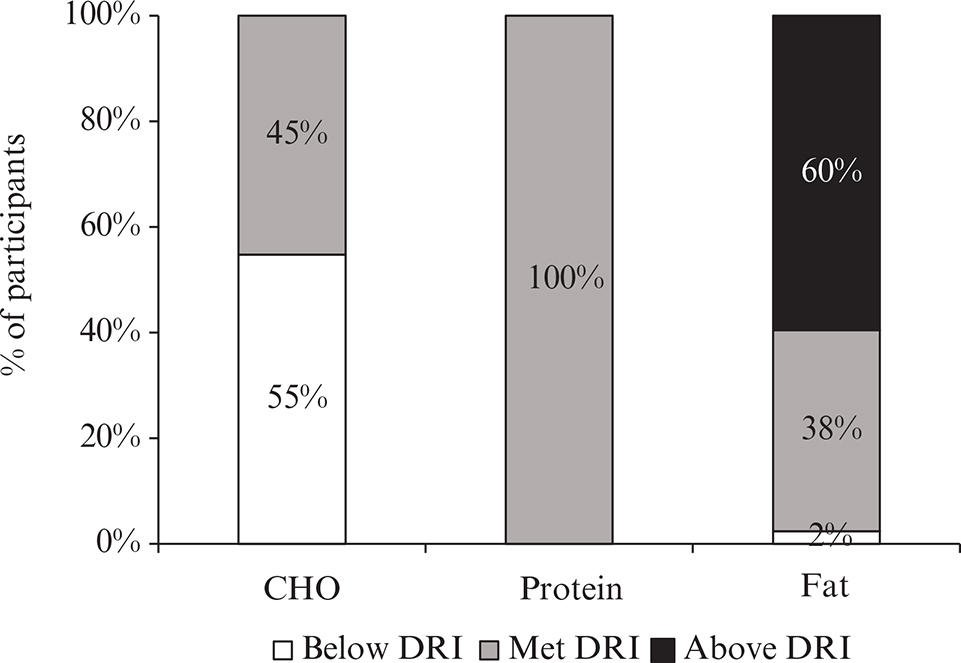 The proportion of energy provided by protein, carbohydrates, and fats in the participants’ diets was approximately 18.5, 42.4 and 36.5%, respectively (Table 3). Overall, these values are approaching the Health Canada recommendations for macronutrient intake; however, fat was slightly above and carbohydrates were slightly below the acceptable macronutrient distribution range for adults (41). The percentage of participants who had macronutrient intake that met or was above or below the DRI is shown in Fig. 2. Carbohydrate intake was below the DRI for 55% of participants and met by 45%, while the DRI for protein intake was met by 100% of participants. Fat intake was above the DRI for 60% of participants, met by 38%, and below the DRI for 2%.