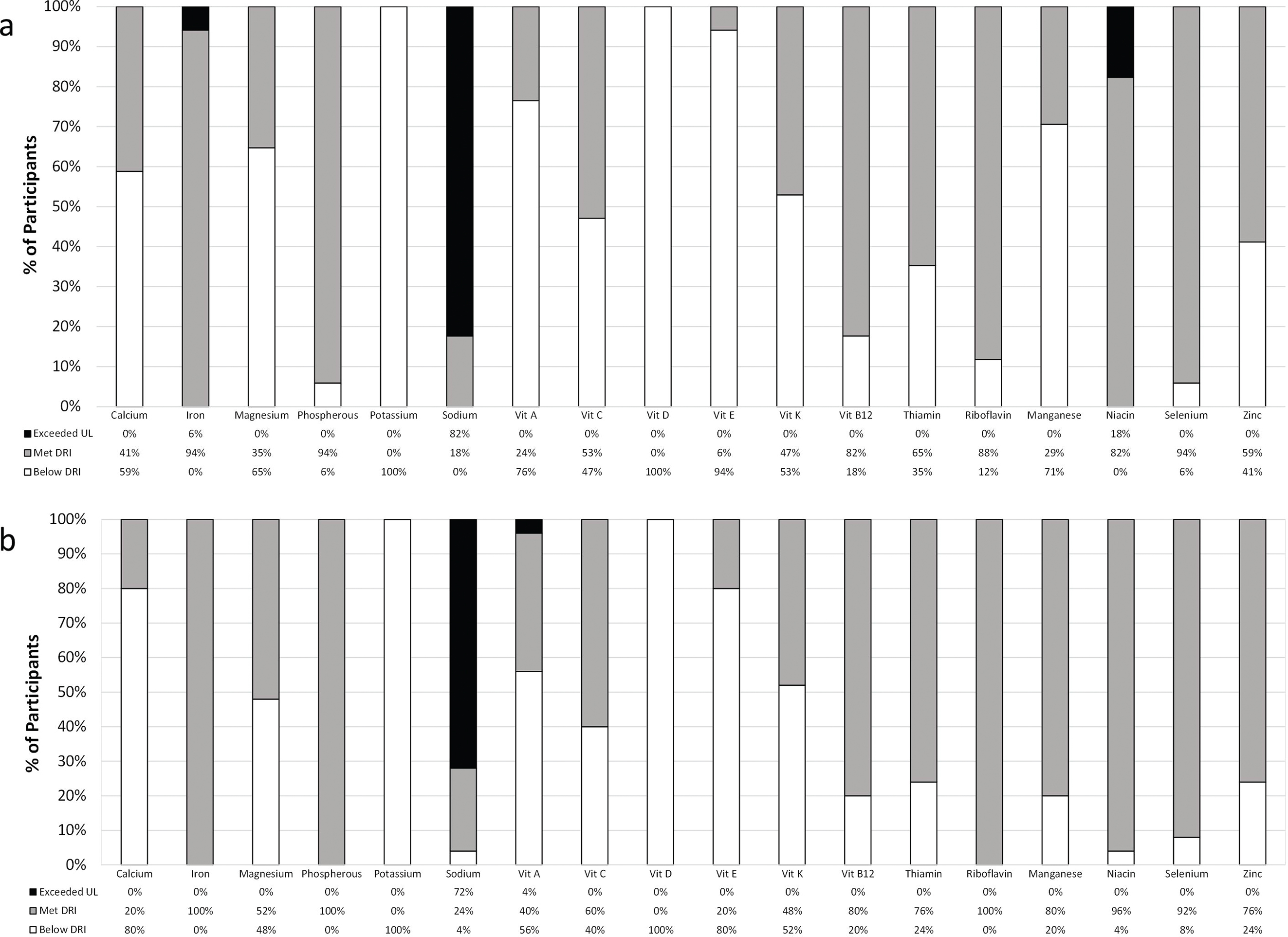 The percentage of participants who had micronutrient intake that met or was below the DRI or exceeded the UL is shown in Fig. 3. Sodium was the chief nutrient that exceeded the UL in both men (Fig. 3a) and women (Fig. 3b). There were also several nutrients for which participants did not meet the DRI; most notably potassium and vitamin D were below the DRI in 100% of both men and women. The intake of numerous other micronutrients was below the DRI to varying extents.