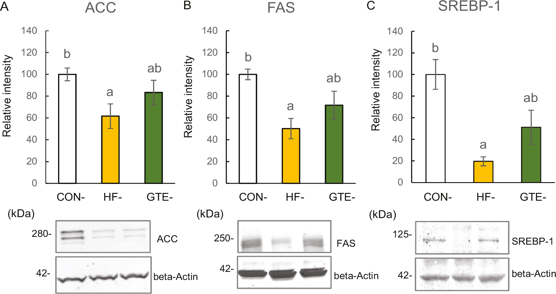 Fig. 3. Protein expressions of acetyl-CoA carboxylase (ACC; A), fatty acid synthase (FAS; B) and sterol regulatory element-binding protein 1 (SREBP-1; C) in the liver of male rat offspring at week 51. For each condition, densitometric analysis was conducted relative to beta-actin. The left column indicates CON-offspring, the middle column indicates HF-offspring and the right column indicates GTE-offspring. CON-offspring: a control-fat diet during gestation, lactation and after weaning; HF-offspring: a high-fat diet during gestation, lactation and after weaning; GTE-offspring: HF diet during gestation, 0.24% GTE-containing HF diet during lactation and HF diet after weaning. Values are expressed as mean ± SEM (n = 6). Data were tested using one-way ANOVA followed by Fisher’s LSD test. The bars in the different serial shown by the different letters significantly differ from each other at a level of 5%.