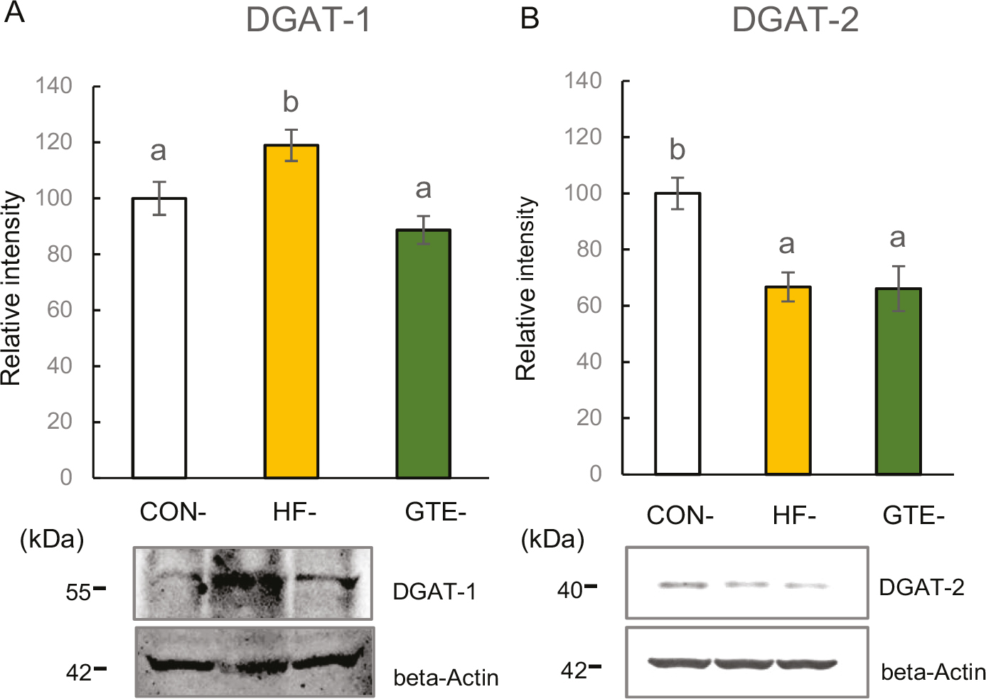 Fig. 4. Protein expressions of diacylglycerol O-acyltransferase 1 (DGAT-1; A) and diacylglycerol O-acyltransferase 2 (DGAT-2; B) in the liver of male rat offspring at week 51. For each condition, densitometric analysis was conducted relative to beta-actin. The left column indicates CON-offspring, the middle column indicates HF-offspring and the right column indicates GTE-offspring. CON-offspring: a control-fat diet during gestation, lactation and after weaning; HF-offspring: a high-fat diet during gestation, lactation and after weaning; GTE-offspring: HF diet during gestation, 0.24% GTE-containing HF diet during lactation and HF diet after weaning. Values are expressed as mean ± SEM (n = 6). Data were tested using one-way ANOVA followed by Fisher’s LSD test. The bars in the different serial shown by the different letters significantly differ from each other at a level of 5%.