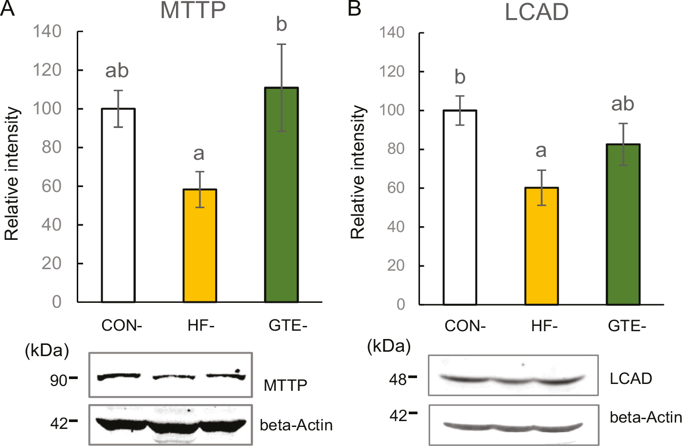 Fig. 5. Protein expressions of microsomal triglyceride transfer protein (MTTP; A) and long-chain acyl-CoA dehydrogenase (LCAD; B) in the liver of male rat offspring at week 51. For each condition, densitometric analysis was conducted relative to beta-actin. The left column indicates CON-offspring, the middle column indicates HF-offspring and the right column indicates GTE-offspring. CON-offspring: a control-fat diet during gestation, lactation and after weaning; HF-offspring: a high-fat diet during gestation, lactation and after weaning; GTE-offspring: HF diet during gestation, 0.24% GTE-containing HF diet during lactation and HF diet after weaning. Values are expressed as mean ± SEM (n = 6). Data were tested using one-way ANOVA followed by Fisher’s LSD test. The bars in the different serial shown by the different letters significantly differ from each other at a level of 5%.