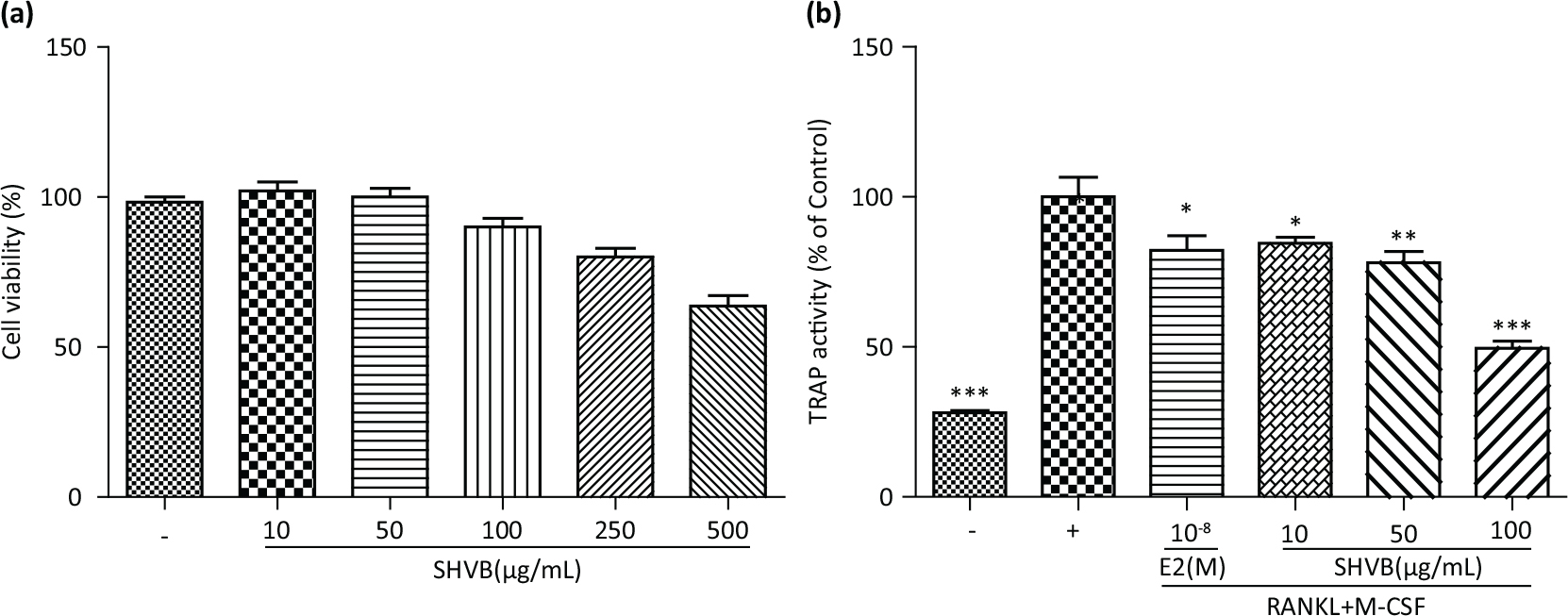 Fig. 1. SHVB inhibits RANKL-induced osteoclastogenesis in vitro. (a) Cell viability was measured using the MTT method. (b) Bone marrow cells (1 × 104 cells/mL) were incubated with SHVB in the presence of M-CSF (30 ng/mL) and RANKL (100 ng/mL) for 5 days. Osteoclastogenesis was confirmed by TRAP staining. Data represent the mean ± S.E. (n = 3). *P < 0.05, **P < 0.01, and ***P < 0.001 indicate statistically significant differences from the control group.