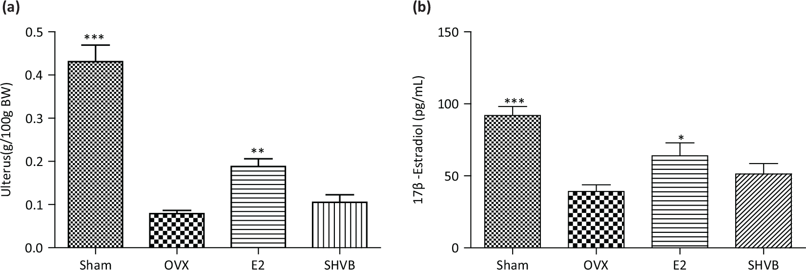 Fig. 6. SHVB did not affect uterus weight and serum estradiol. (a) Uterus index and (b) estradiol. Data are expressed as mean ± S.E. (n = 10). *P < 0.05, **P < 0.01, and ***P < 0.001 versus OVX rats.