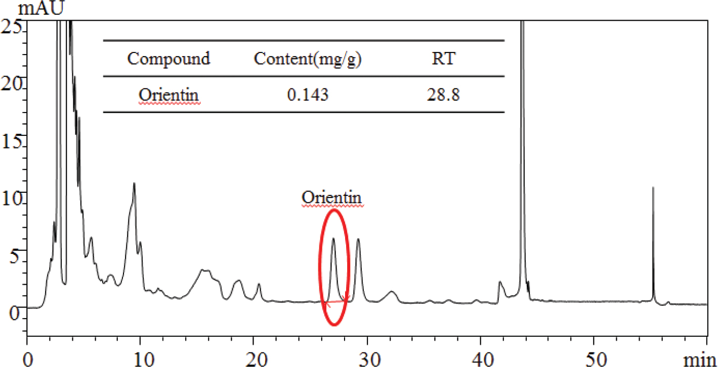 As shown in Fig. 7, SHVB was standardized based on the Orientin content, which was determined using high-performance liquid chromatography. The standardized SHVB relative to the main ingredients Orientin (R 2 = 0.9994) indicated good linearity, while their retention times were typically detected near 28.8 min. The mean Orientin content in the SHVB was approximately 0.143 mg/g of extract.