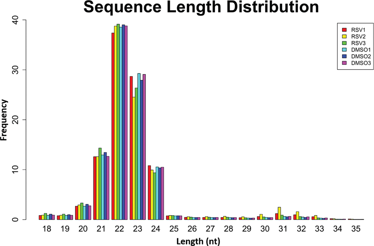The length distributions (18nt–35nt) of sRNAs in RSV1, RSV2, RSV3, DMSO1, DMSO2 and DMSO3 samples were similar (Fig. 1). The major length of sRNAs in this study was 20nt–24nt, which was typical of sRNA of dicer-processed products (Fig. 1). Obviously, 22nt was the most frequent length, followed by 23nt, 21nt, and 24nt in the six samples (Fig. 1 and Table S2).