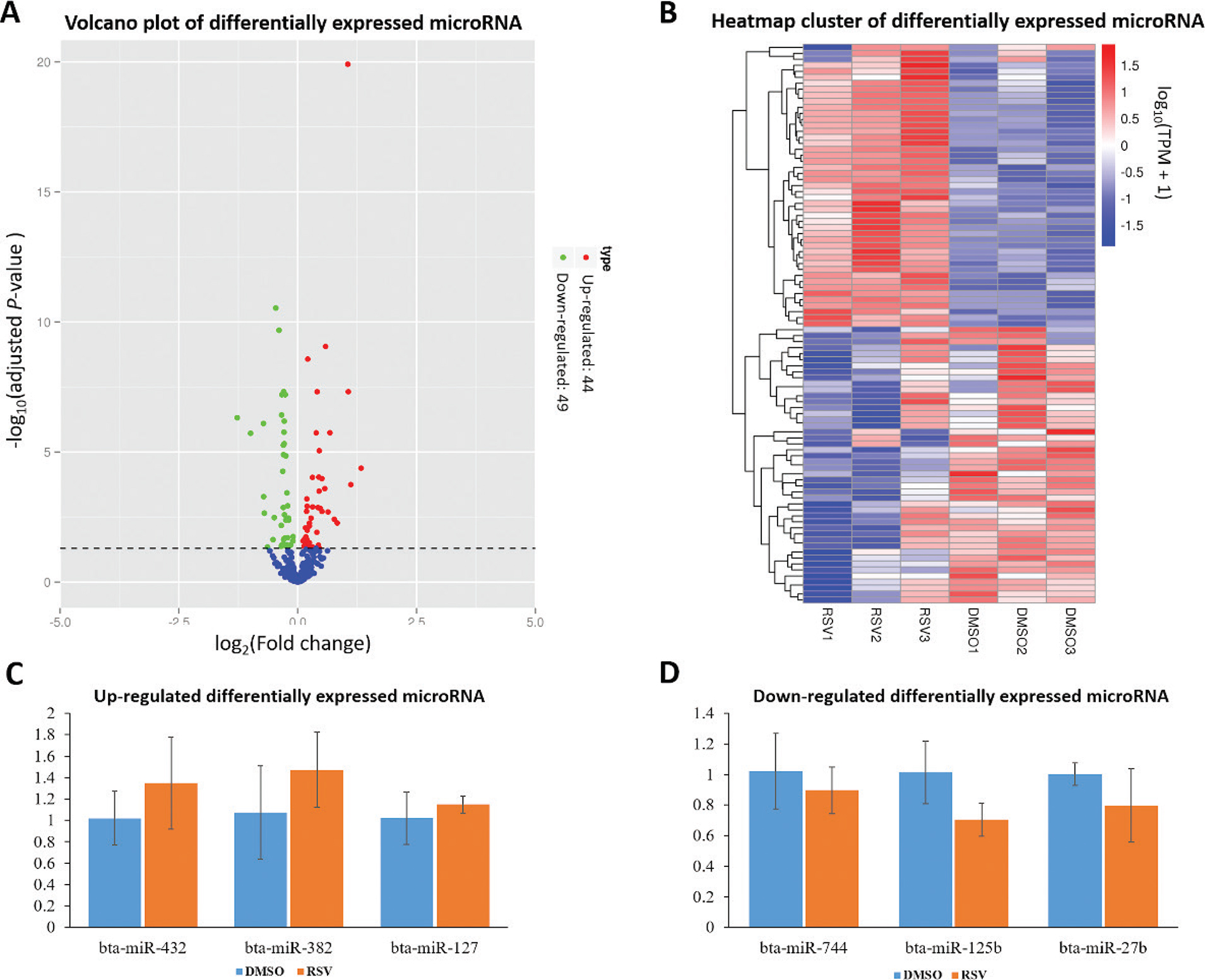 Fig. 2. Differentially expressed (DE) analysis of microRNAs (miRNAs). (A) Volcano plot of upregulated and downregulated DE miRNAs. (B) Cluster of DE miRNAs in three replicates of case and control groups. Note: the colors from blue to red indicate the miRNA expression levels from low to high after the transform of log10(TPM + 1). RSV1, RSV2, and RSV3 indicate the case groups that were treated with resveratrol (RSV). DMSO1, DMSO2, and DMSO3 indicate the control groups that were only treated with DMSO with RSV. (C) qRT-PCR validation for upregulated DE miRNAs, including bta-miR-432, bta-miR-382, and bta-miR-127. (D) qRT-PCR validation for downregulated DE miRNAs, including bta-miR-744, bta-miR-125b, and bta-miR-27b.