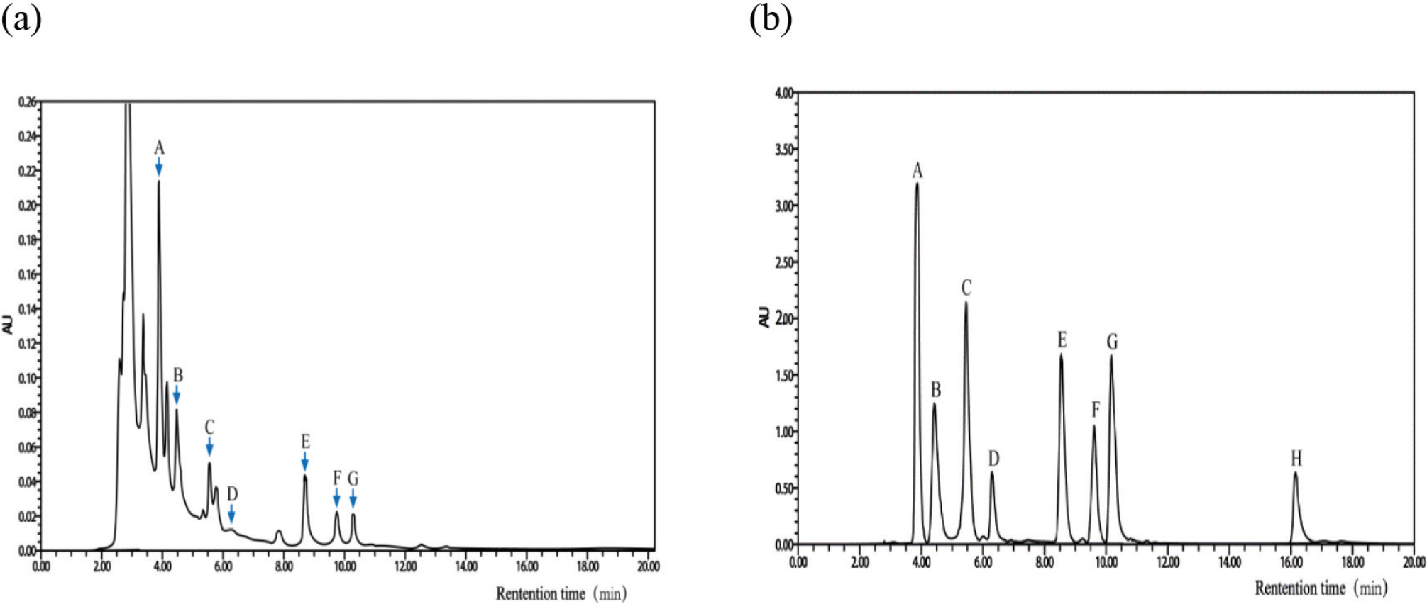 Fig. 1. High-performance liquid chromatography (HPLC) analysis of the major compounds in CEPM. (a) HPLC analysis of standards, including (A) 5-hydroxymethylfurfural, (B) mumefural, (C) caffeic acid, (D) rutin, (E) citric acid, (F) naringin, (G) hesperidin, and (H) quercetin. (b) HPLC analysis of CEPM showing the presence of (A) 5-hydroxymethylfurfural, (B) mumefural, (C) caffeic acid, (D) rutin, (E) citric acid, (F) naringin, and (G) hesperidin.