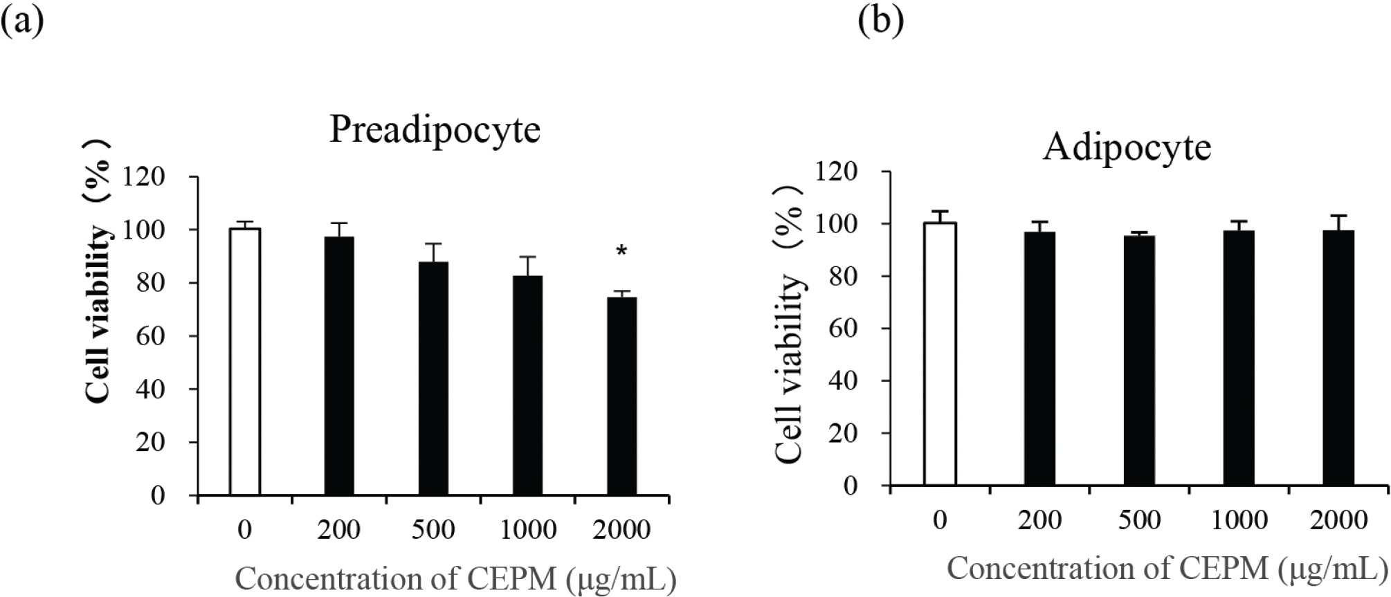 Fig. 2. The effect of CEPM on the viability of 3T3-L1 cells. (a) The cell viability of preadipocytes treated with different concentrations of CEPM for 24 h. (b) The cell viability of adipocytes treated with different concentrations of CEPM for 24 h. Data are presented as the mean ± SD from three independent experiments. *Significant difference at P < 0.05.