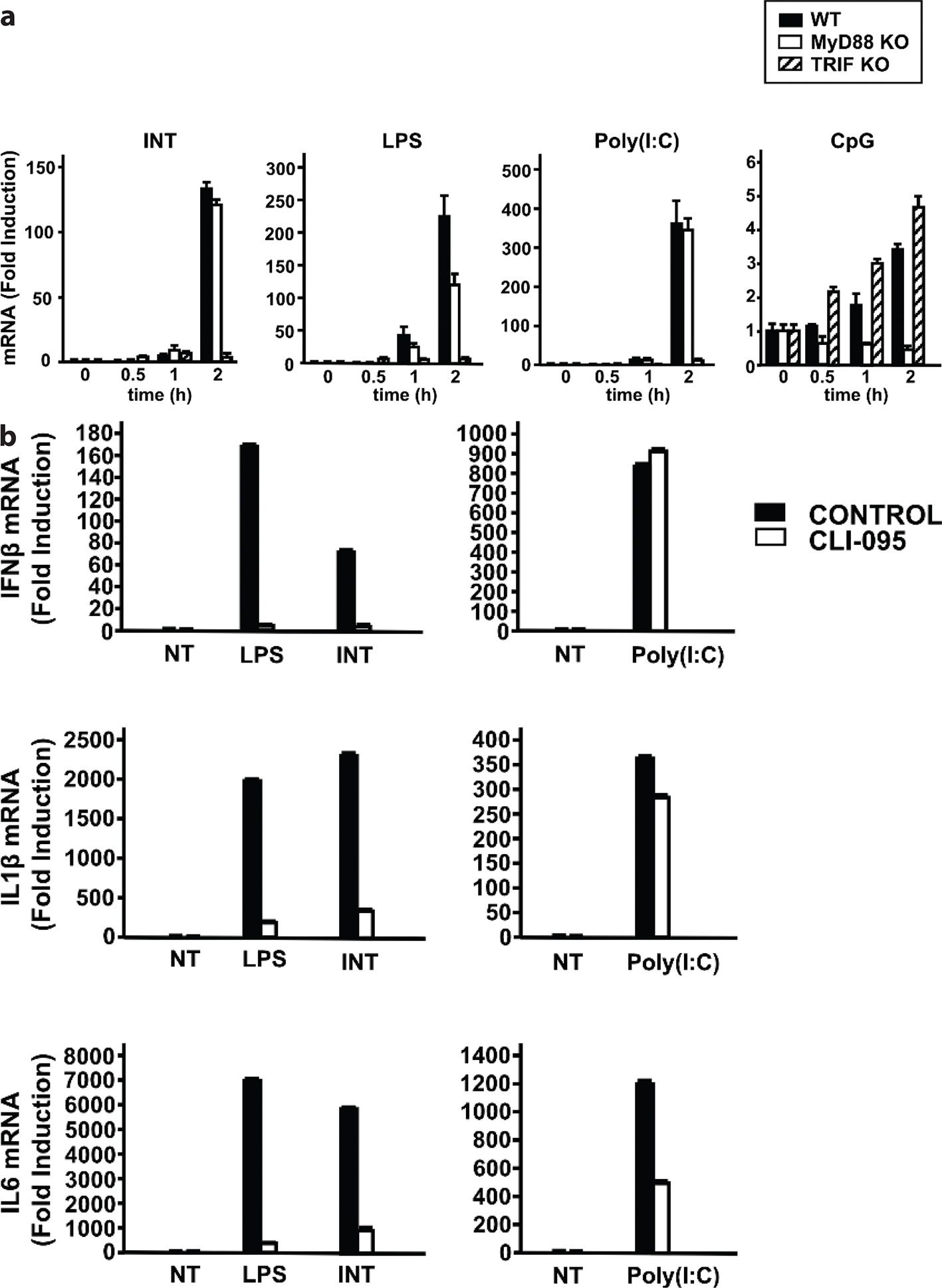 Fig. 2. Internatural (INT) signals through TLR4. The values represent the average of technical duplicates ± SD. Hereafter, results are representative of two independent experiments. (a) Induction of Ifnβ expression by INT, lipopolysaccharide (LPS), polyinosine-polycytidylic acid [poly(I:C)], and CpG in bone marrow-derived macrophages (BMDMs) isolated from wild-type C57BL/6 mice, MyD88-KO mice, or TRIF-KO mice (C57BL/6 background). BMDMs were treated with INT (diluted 1:1,000), LPS (200 ng/mL), poly(I:C) (1 μg/mL), or CpG (1826 ODN, 1 μg/mL) for 0–2 h. Ifnβ mRNA levels were measured as described in Fig. 1. (b) The effect of the TLR4 inhibitor, CLI-095, on the induction of Ifnβ (top), Il1β (middle), and IL-6 (bottom) expressions. BMDMs were treated for 6 h with INT, LPS, or poly(I:C) in the presence or absence of CLI-095 (3 μM).