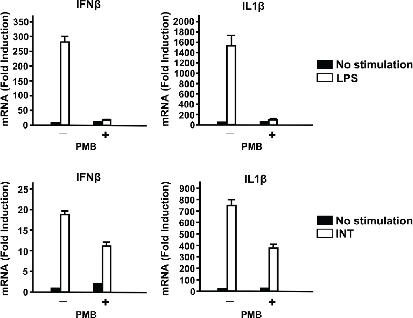 Fig. 3. Ifnβ and Il1β are induced upon internatural (INT) stimulation, not lipopolysaccharide (LPS) contamination. The effect of polymyxin B (PMB) on the induction of Ifnβ and Il1β expressions by INT or LPS is shown. Bone marrow-derived macrophages were treated for 2 h with INT or LPS with or without PMB. The values represent the average of technical duplicates ± SD. Hereafter, results are representative of three independent experiments.