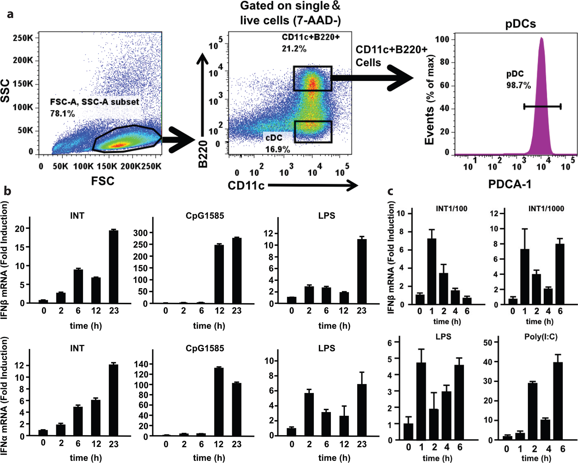 To assess the range of cells in which INT induces IFNs, we tested plasmacytoid DCs (pDCs) and MEFs for their ability to induce type I IFNs by INT. pDCs produce high levels of type I IFNs in response to viral infection and other stimuli (35, 36) but respond to LPS moderately because they express TLR4 at lower levels than in BMDMs (25, 35). MEFs and other fibroblasts express varying levels of TLR4 and mildly respond to LPS to induce type I IFNs (37). We generated pDCs from BM cells in the presence of Flt3L and isolated using fluorescence-activated cell sorting (FACS) (38). The FACS profile in Fig. 4a shows CD11c+, PDCA-1+, and B220+ pDC populations. pDCs were treated with INT, LPS, or poly(I:C) and tested for induction of IFNβ and IFNα (Fig. 4b). INT and LPS induced modest amounts of IFNs, which peaked at 1 day later (23 h) (Fig. 4b, left and right panels). In contrast, CpG induced both IFNs at much higher levels, peaking at 12 h and 23 h (Fig. 4b, middle panel).