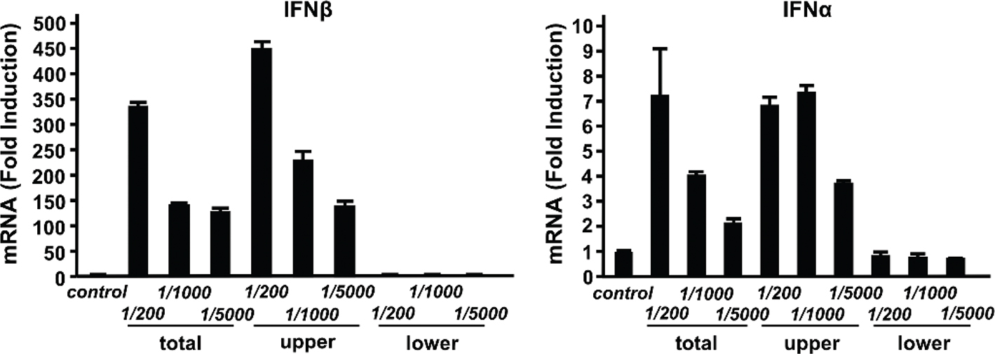 To begin assessing the molecular properties of INT, we investigated approximate MWs of its active components. We used an ultracentrifugation system to fractionate INT into components larger or smaller than 10,000 MW. The two fractions were tested for induction of IFNβ and IFNα (Fig. 5). We found that the high-MW fraction induced both Ifnα and ifnβ at a-levels comparable to or greater than unfractionated INT. In contrast, the low-MW fraction did not induce a significant amount of either IFNα or Ifnβ.