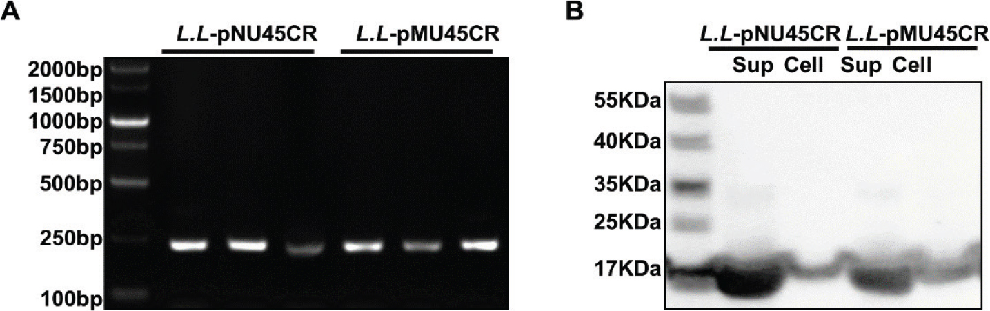 Fig. 1. Construction of CRAMP-secreting L. lactis NZ9000. (A) Polymerase chain reaction (PCR) products of CRAMP connected with a Usp45 signal peptide (Usp45 + CRAMP) in L.L-pMU45CR and L. L-pNU45CR were determined by agarose gel electrophoresis. L. L-pMU45CR was based on pMG36e plasmids, and L. L-pNU45CR was based on pNZ8148 plasmids. The product size of Usp45 + CRAMP is 243 bp. (B) Protein expression of CRAMP in recombinant bacterial cells and supernatant (Sup) was examined by Western blotting.