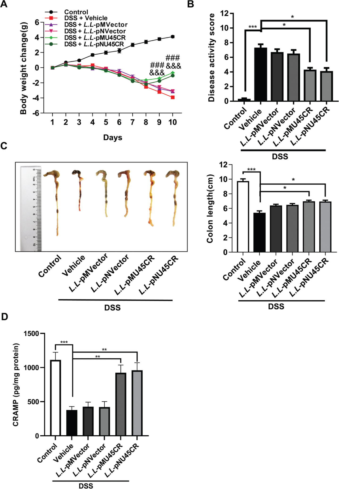Fig. 2. Recombinant CRAMP-producing L. lactis NZ9000 attenuates dextran sodium sulfate-induced colitis. (A) Weight change was recorded every day (g); (B) comparison of disease activity score on day 10; (C) colon length was measured on day 10. L.L-pMVector is recombinant L. lactis NZ9000 with pMG36e empty vector and L. L-pNVector is recombinant L. lactis NZ9000 with pNZ8148 empty vector. (D) CRAMP expression in colonic tissues was detected by ELISA. Data are expressed as means ± SEM, n = 5. ###P < 0.001 compared between Vehicle and L. L-pMU45CR group in Fig. 2A; &&&P < 0.001 compared between Vehicle and L. L-pNU45CR group in Fig. 2A; *P < 0.05, ***P < 0.001.