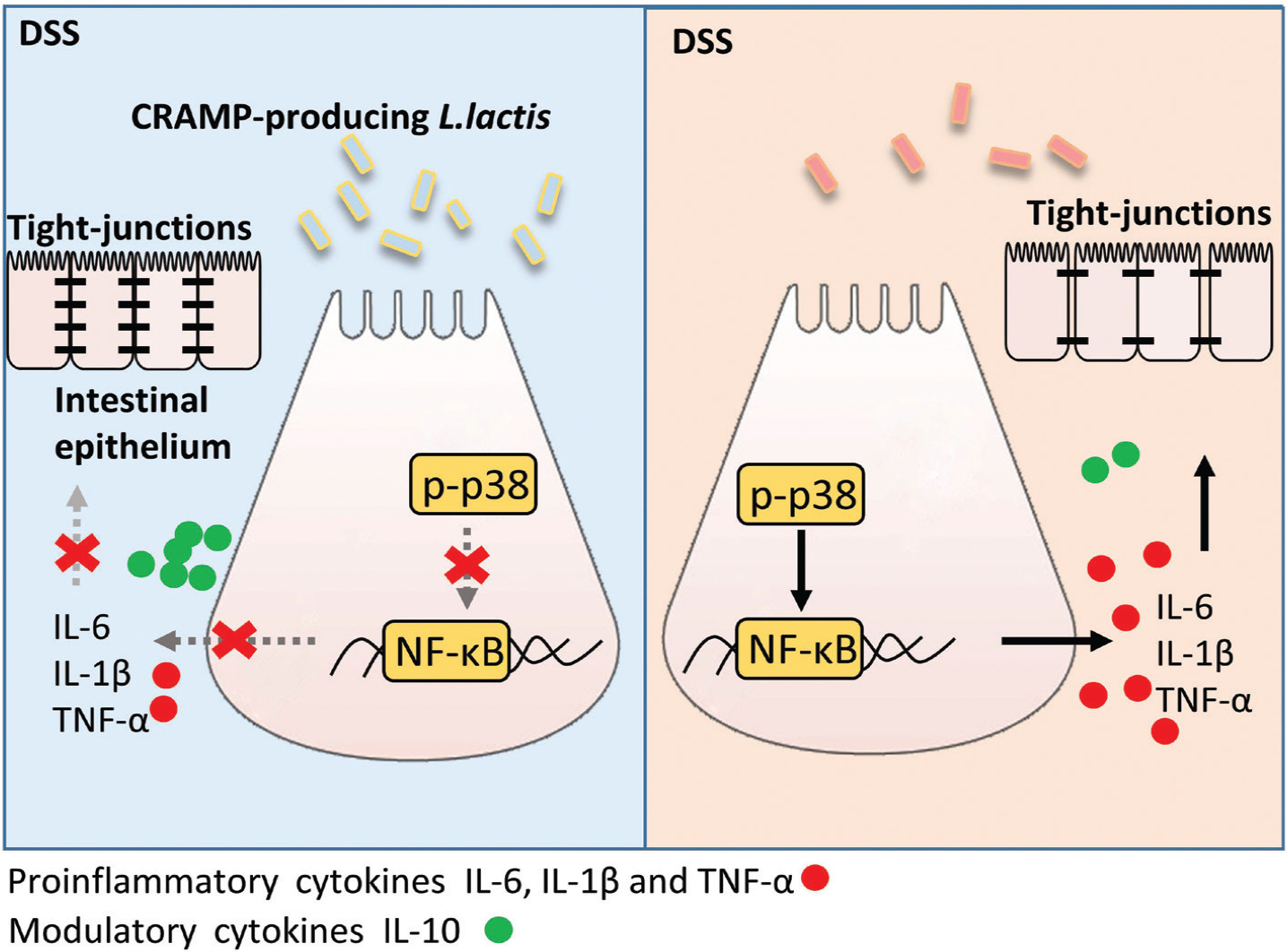 Results: Both CRAMP-producing L. lactis NZ9000 strains protected against colitis, as shown by reduced weight loss and disease activity score, improved colon shortening, and histopathological injury. In addition, CRAMP-producing L. lactis NZ9000 restored gut barrier by upregulating ZO-1, ZO-2, and occludin. Moreover, CRAMP-producing L. lactis NZ9000 regulated the colonic cytokines profile with reduced IL-6, IL-1β, and TNF-α production, and increased IL-10 production. By further analysis, we found that CRAMP-producing L. lactis NZ9000 reduced the expression of p-p38 and p-p65.
