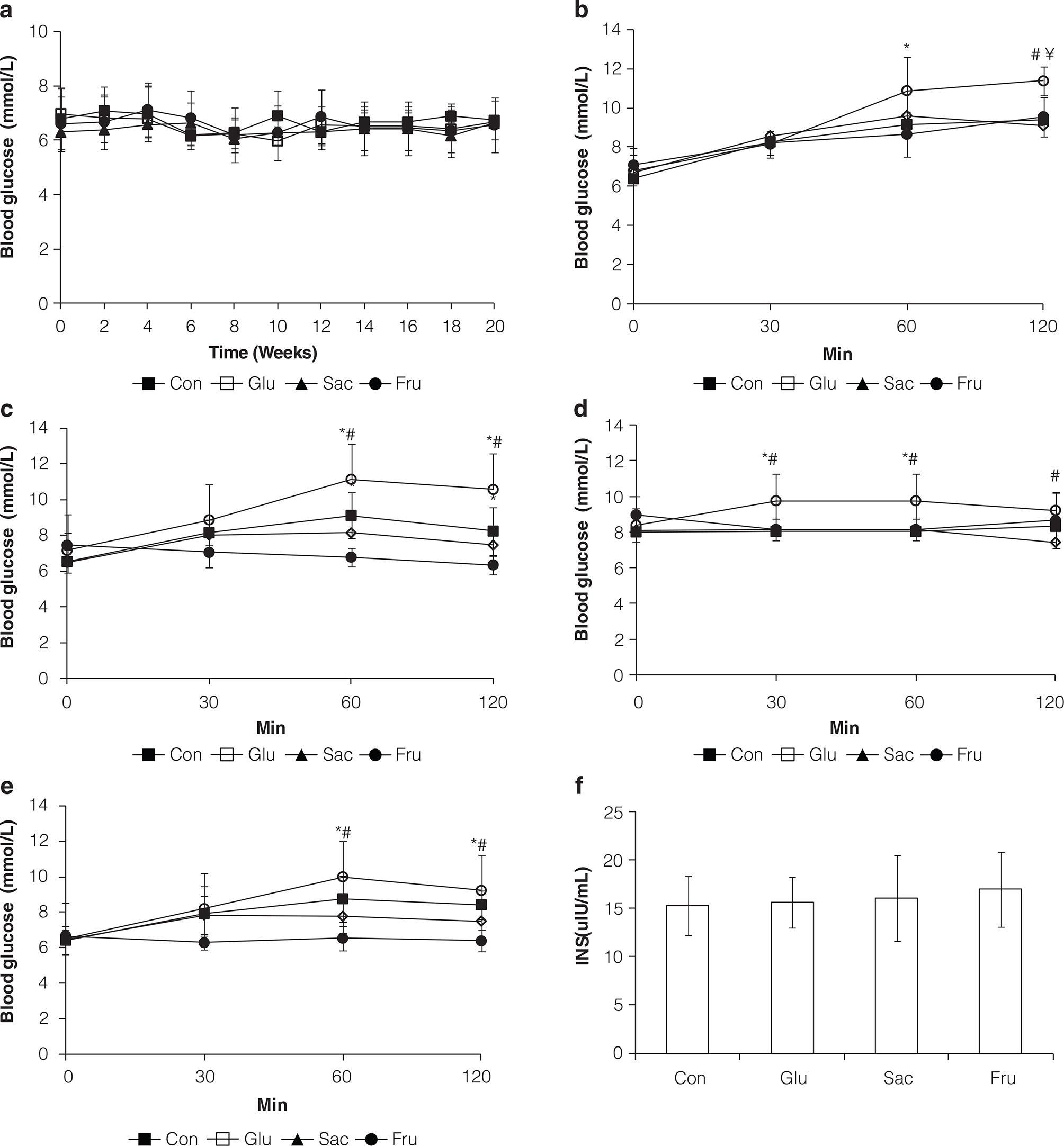 Fig. 2. Glucose and insulin level alteration of rats in Con, Glu, Sac and Fru groups. (a) Glucose level changes along time during 20 weeks of feeding; (b) Postprandial glucose level changes without a 12 h fasting on week 18; (c) Glucose level changes with a 12 h fasting on week 10; (d) Postprandial glucose level changes without a 12 h fasting on week 10; (e) Glucose level changes with a 12 h fasting on week 18; (f) Insulin levels in the serum of rats on week 20. Data are expressed as the means ±SD, n = 10 per group; *P < 0.05 vs. control group; #P < 0.05 vs. fructose group; ¥P < 0.05 vs. saccharose group.