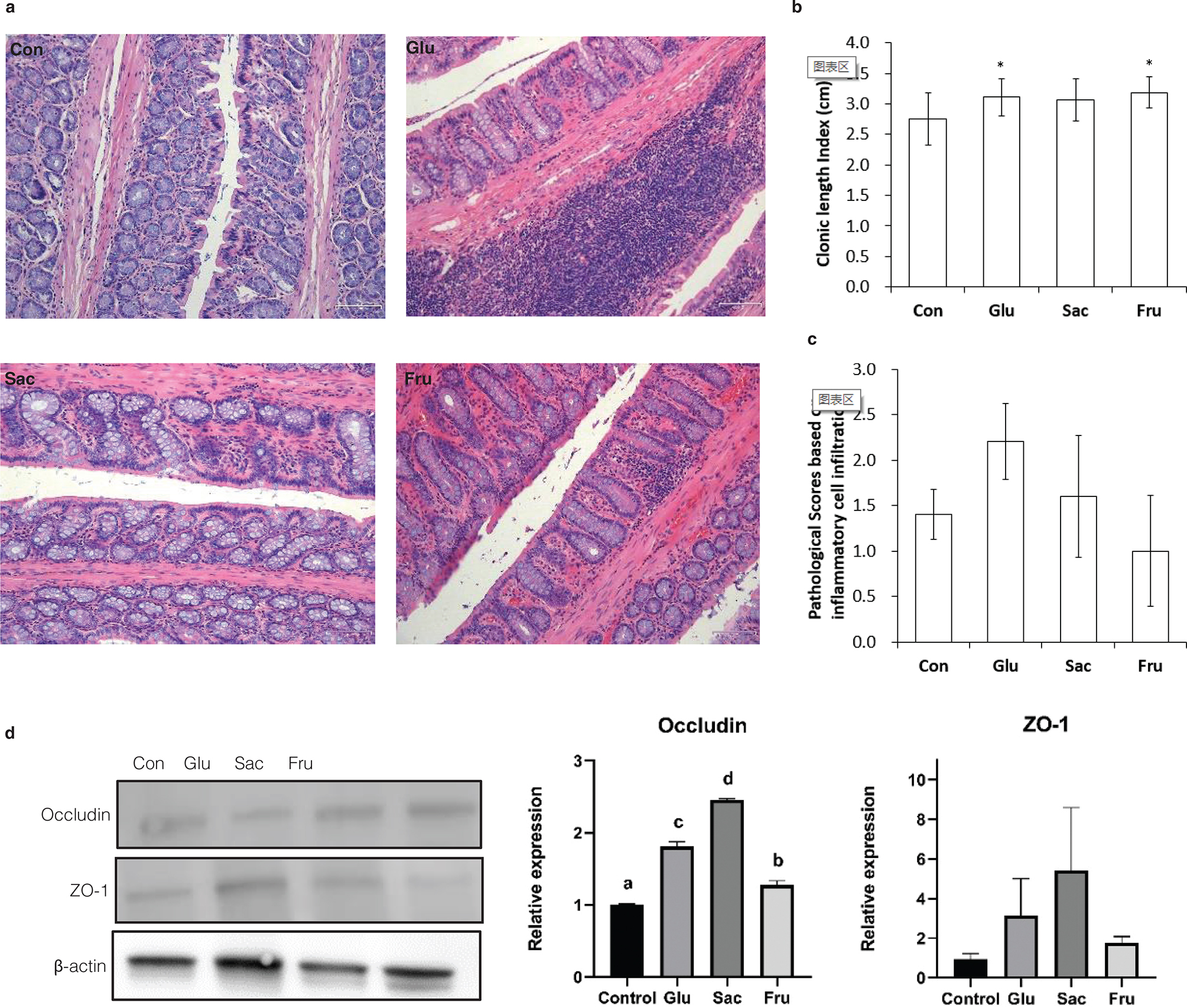 Fig. 5. Effects of different sugar on colon of rats in Con, Glu, Sac and Fru groups. (a) Representative micrographs of HE-stained sections of rat colon. (40×); (b) Colonic length index of rats at the end point of the experiments, Data are expressed as the means ± SD, n = 10 per group; (c) Scores based on inflammatory cells infiltration. Data represent means ± SD (n = 5).*P < 0.05 vs. control group; (d) Western blot analysis of occludin and ZO-1 expression in colon. Band densities were quantified by densitometry analysis. Data are presented after normalization to β-actin level. Data represent means ± SD (n = 3). Different superscripts indicated significant differences (P < 0.01, n = 3).